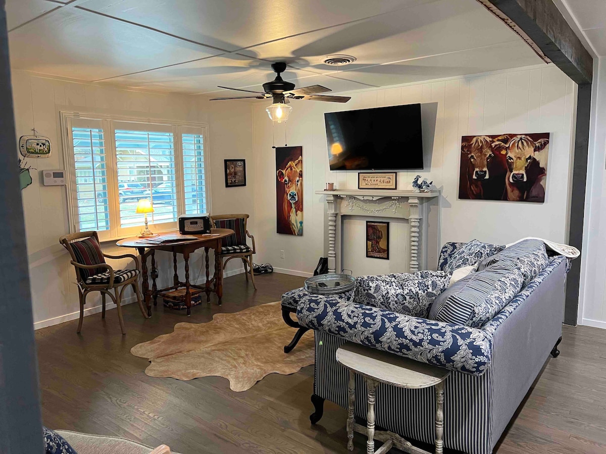 AirBnB “Guest Favorite!” One block from one of the most fabulous Historic downtowns in Texas! Sweet special place for your special getaway! You will love this charming cottage for so many reasons- location of course but then you will love the details that make this place so comfy-2 king beds, 1 queen,1 twin +sleeper sofa, comfortable living w 55" smart tv wifi, well equipped kitchen, spacious dining area plus cozy kitchen nook, bonus room, laundry & FABULOUS front & back stone patios & Firepit!
