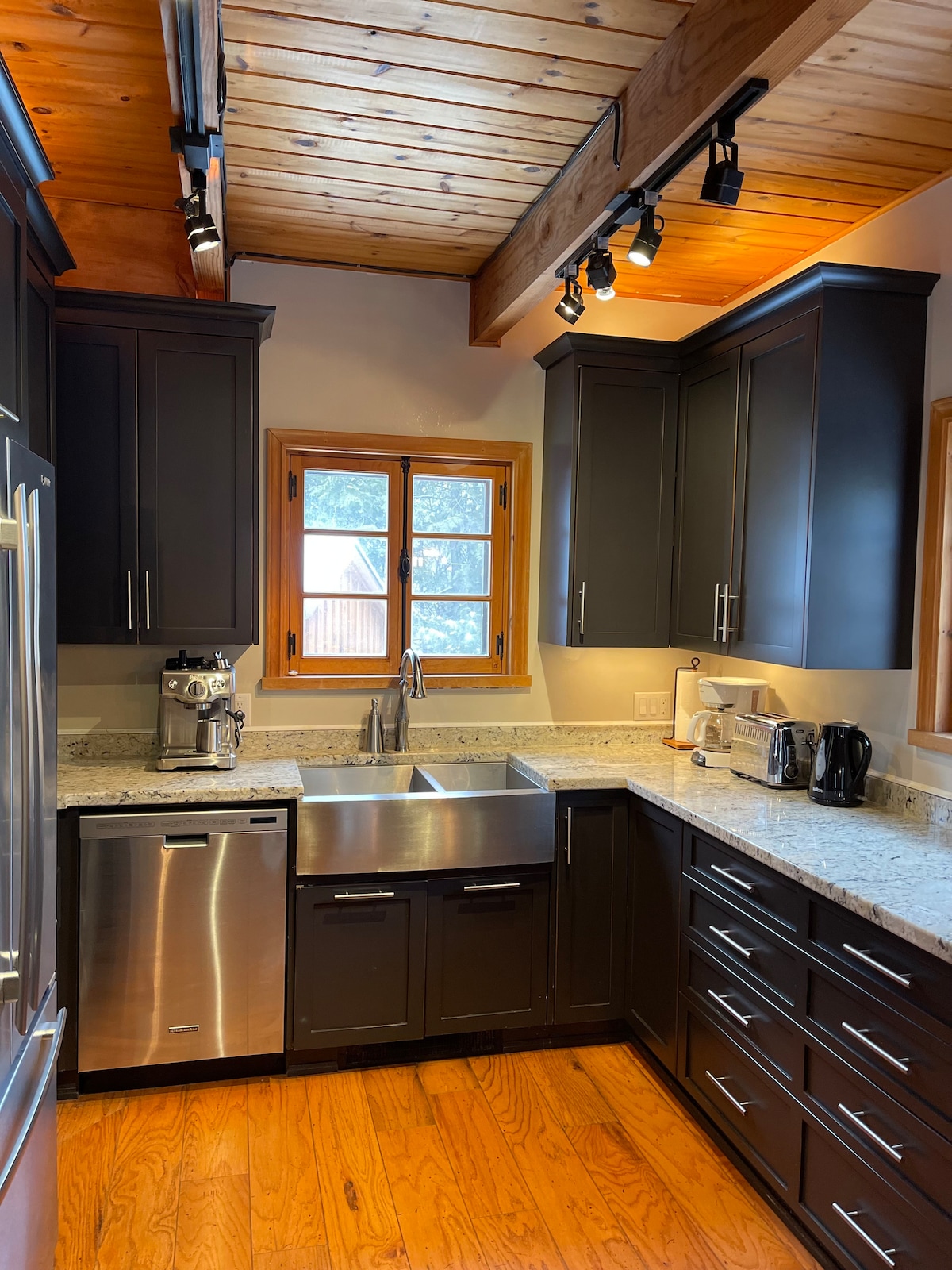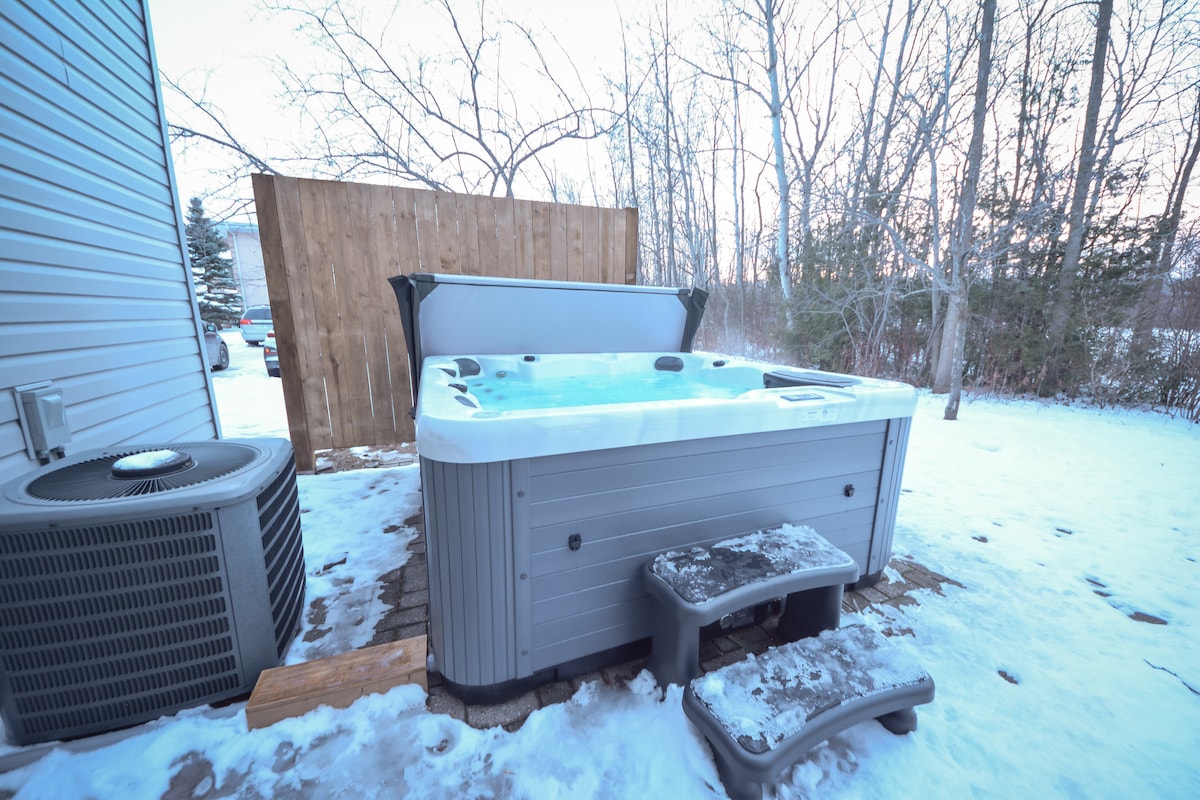 A real gem! Warm & inviting, our 3 bdrm chalet comfortably sleeps 8 & offers an upscale setting for your special Blue Mountain getaway. Decorated with a mix of vintage & modern to provide the very best comfort, we offer a 6 person Hottub on our south facing upper deck, Gourmet Kitchen, Spa Bathroom, 3 Smart TVs, WiFi, Laundry, Propane BBQ, & so much more. Come with families, friends, or just the 2 of you, to relax & put your feet up. In the country yet 2 minutes from town. You'll love it!