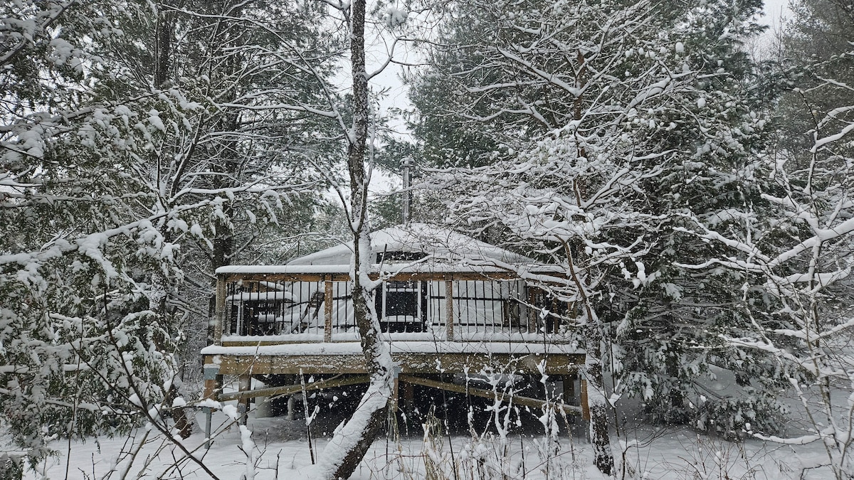 ReLive Retreat's four-season yurt glamping in Ontario. The Juniper is a Mongolian yurt at a peaceful, friendly-dog-friendly, private nature retreat, perfect for couples and solo escapes. Cozy 16’ round space with wood-burning stove + propane heat, queen bed + single fold-out, kitchenette with spring water, attached half bath (compost toilet), private deck & fire-pit, plus a shared wood-fired sauna + 3-season showers. Set on a private and quiet 72-acre property surrounded by forest and wildlife.