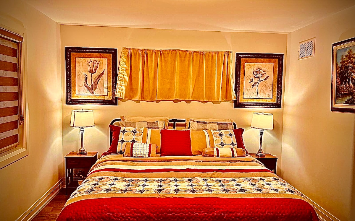 Forget your worries in this spacious and serene space at Highland Estates. A designer suite perfect for couples, equipped with a King Sized Bed, and a Jacuzzi for romantics. Prepare your own meals in the kitchen with Microwave and Electric Stove. Access your favorite Streaming-TV accounts like Netflix, Prime, and Disney+ Close to Vetta Spa and major Ski Hills; literally the Best Retreat in Oro-Medonte. Book with Us Today! Please note the dishwasher is out of order.