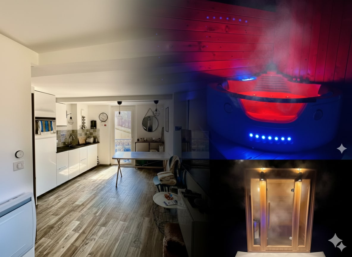 Duplex lumineux & SPA idéal pour un séjour paisible à deux au cœur de Collioure. Cuisine équipée, salon Smart TV, chambre à l’étage avec lit 160 cm et vidéoprojecteur Chromecast. Salle d’eau avec douche à l’italienne, wifi, climatisation et fibre. Accès privatif (21 h - 23 h) à l’espace bien-être avec sauna traditionnel et spa balnéo. À une minute de la plage. Linge et ménage professionnels inclus.