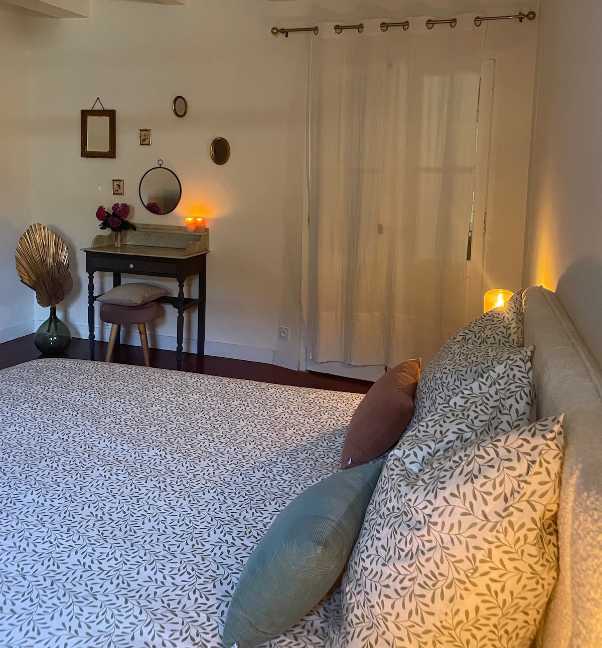 Settle into our spacious 57 m² apartment, located in the heart of the medieval city, in a fully pedestrian area. Here, peace and authenticity await you. - Bedroom with a queen-size bed (160x200) and high-quality bedding - Bright living room with a sofa bed (150x200) - Fully equipped kitchen (stovetop, oven, microwave, coffee maker, kettle...) - Free Wi-Fi, television, hairdryer, fans - Mosquito screens on the windows for added comfort (no air conditioning)