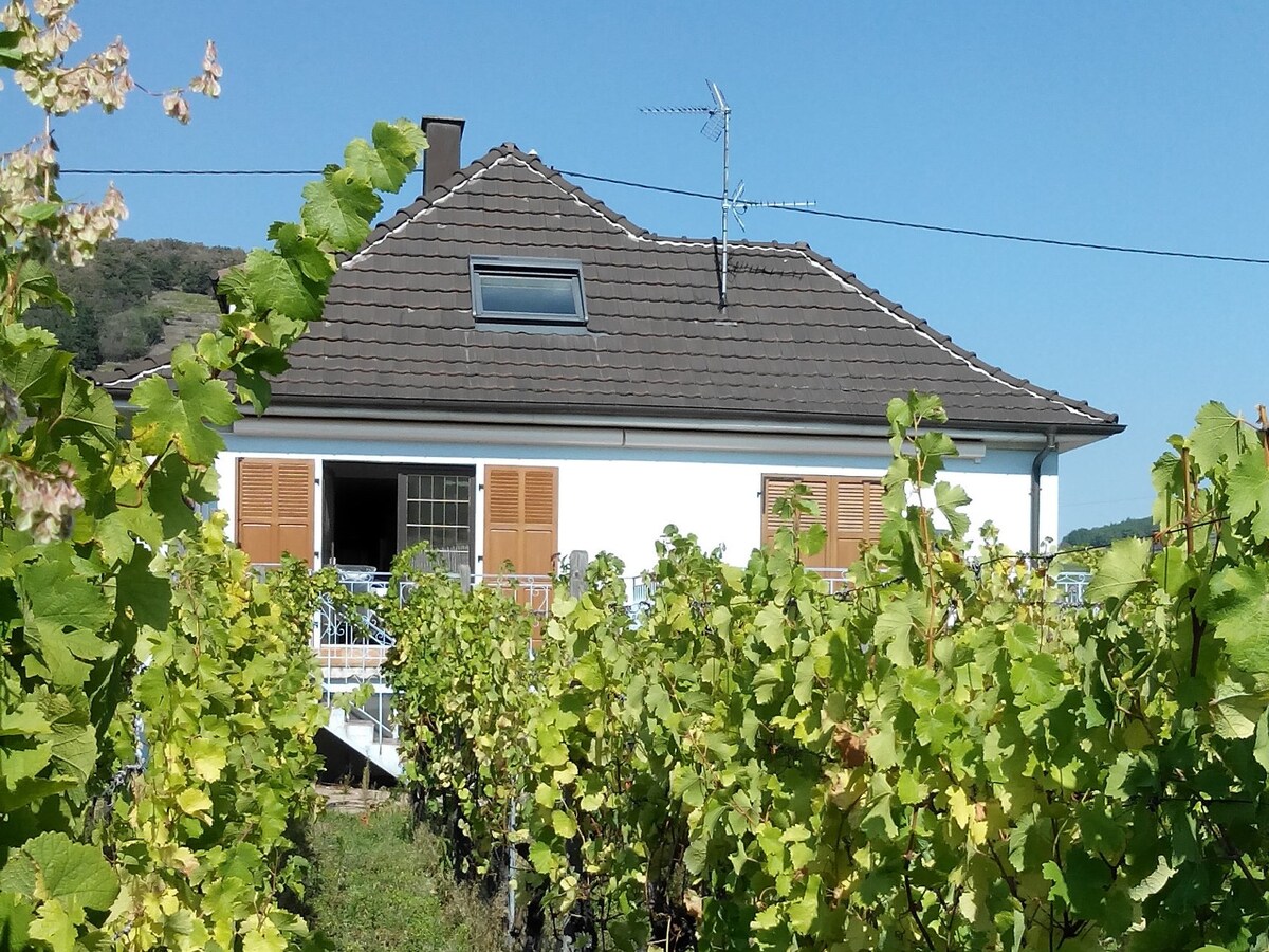 Our detached holiday home is located 1 km from the historic center of Kaysersberg, among vineyards and on the Alsace wine route. The land around the house is fenced and has a south-facing terrace, overlooking the vineyards. The renovated house offers spacious areas for a group of 12 people. 4 star rating. 4 bedrooms, 1 dormitory, 2 bathrooms, 4 toilets, 8 single beds (90x200), 2 double beds (160x200).