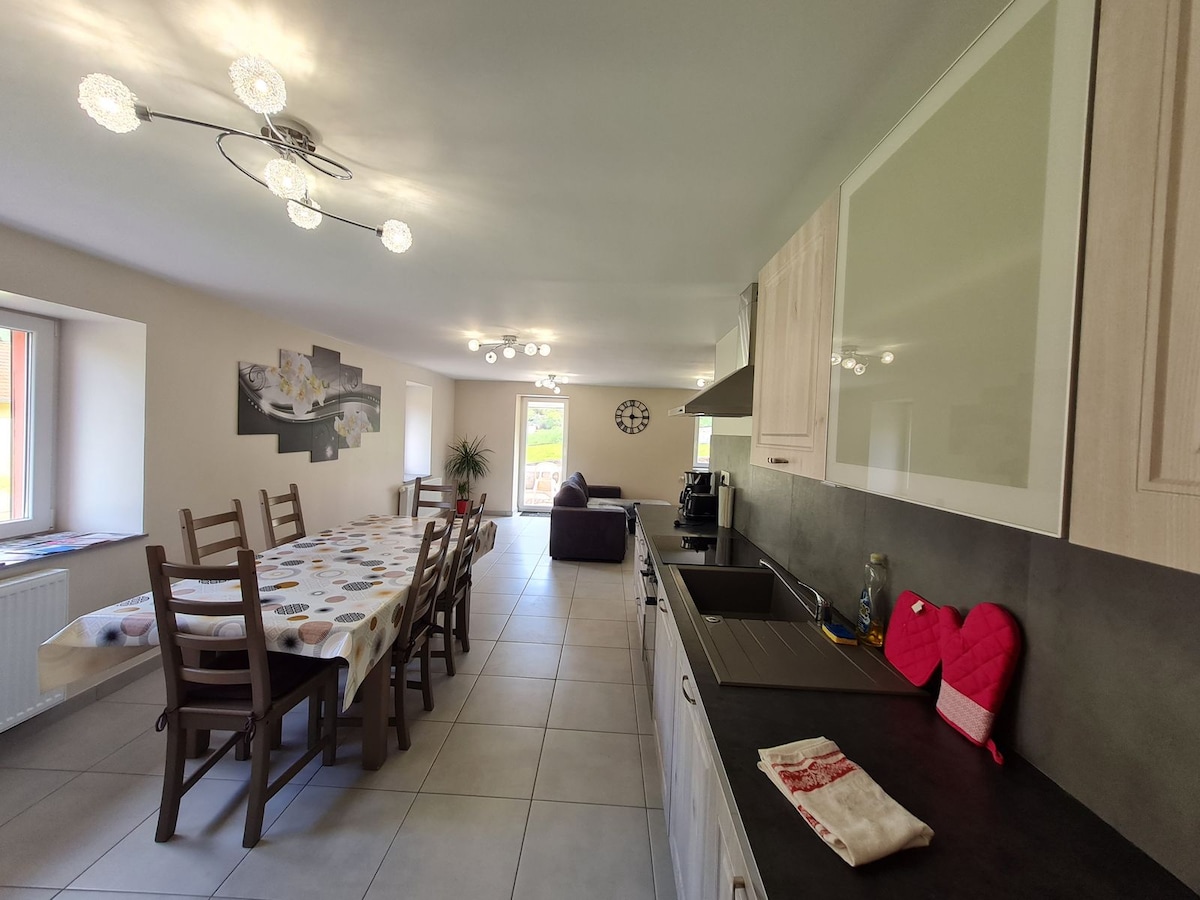 Maison indépendante de 60m2 de plein pied accessible en fauteuil.Capacite 5 personnes. parking. TV. wifi. Cuisine équipée, vaisselle , Lave vaisselle et Lave linge, congélateur.literie de grande qualité et fabrication locale en majorité. Pour votre confort la dalle contient un adjuvant antistress. Lits faits à l'arrivée et serviettes fournies.Vous serez a quelques minutes de Saint Die avec gare TGV, une belle piscine, un bowling, des salles de cinéma, un musée et un site archéologique.