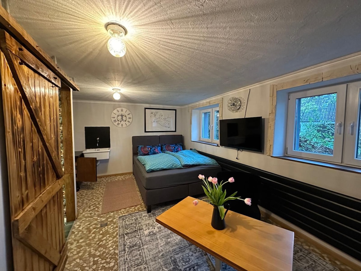 Wir vermieten dieses 36qm- Appartement an Individualisten und Menschen, die Spaß an der Natur und einen freien Lebensstil haben. Das frisch und liebevoll renovierte Appartement ist direkt am Rhein gelegen und im Nebenhaus unseres eigenen Wohngebäudes. Die Einrichtung ist modern und zweckmäßig, vom Fernseher bis hin zum Teelöffel ist alles vorhanden. Eine wunderschöne große Wiese am Wasser lädt zum grillen, genießen oder auch arbeiten ein.