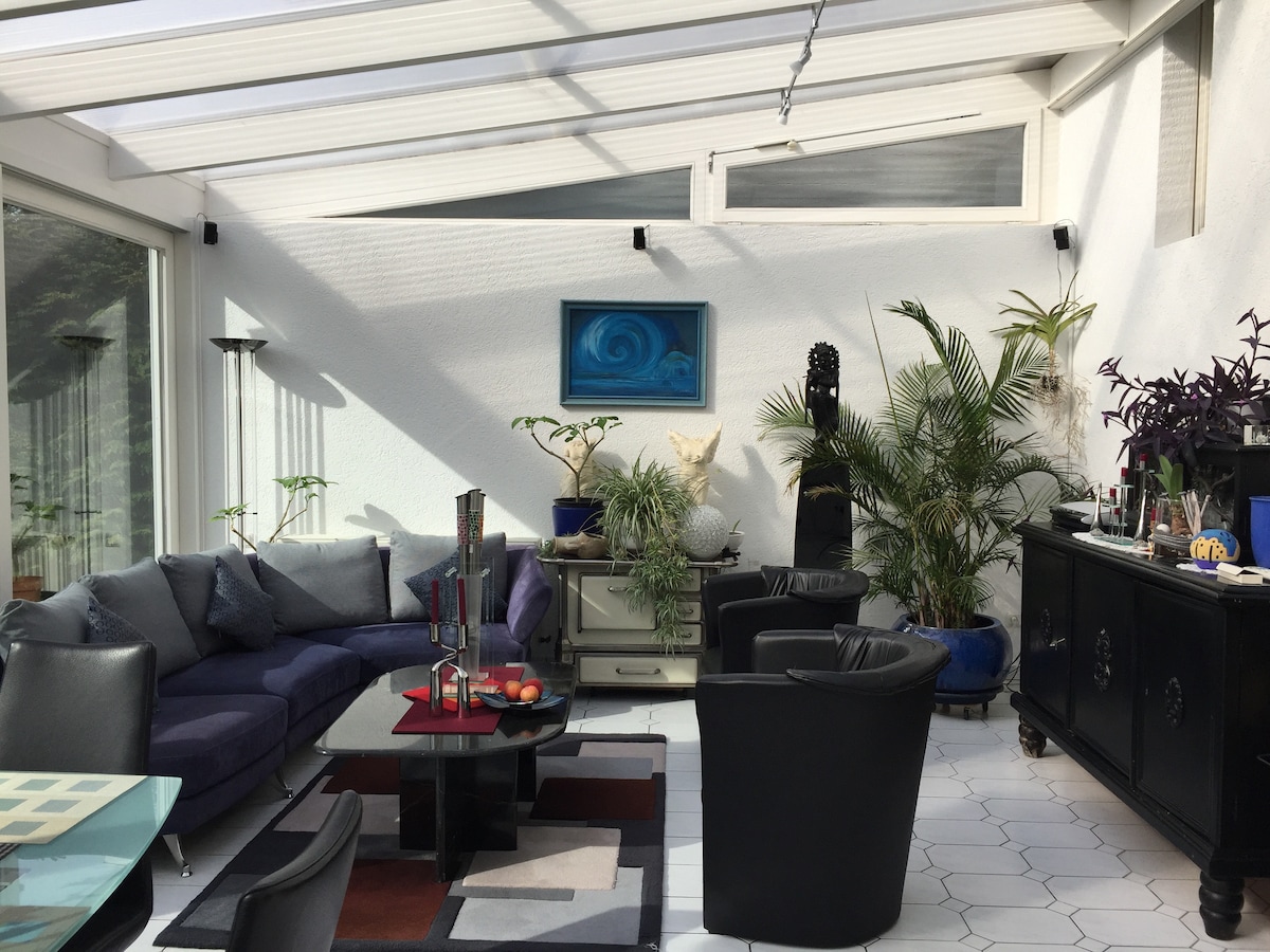 Bright, comfy private room with private shower, workspace, refrigerator, kettle. Breakfast on request. Free high-speed 5k WiFi, free parking in front of the house. Bus stop and e-scooter station at 100m distance. The Düsseldorf Exhibition Center is at 12 km distance, 20 minutes by car, 40 minutes by bus. A taxi costs approx. €50. Areal Böhler is at 4 km distance- 8 minutes by car, 20 minutes by public transport. Düsseldorf Airport, city center and Central Station are at 8km distance.