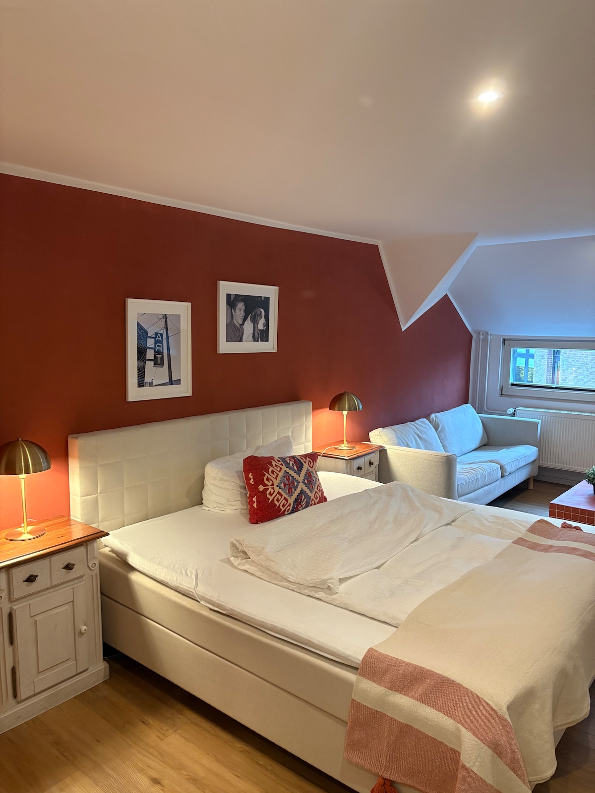 This comfortable studio offers 39 m² of space for up to 4 people. The double bed (160x200), the sofa bed (160x200) and the modern bathroom with shower make this accommodation the perfect starting point to experience Düsseldorf. There is also a kitchenette with sustainable coffee, a kettle, a mini fridge, and a washing machine. Here, you have everything you need for maximum comfort and minimum stress.