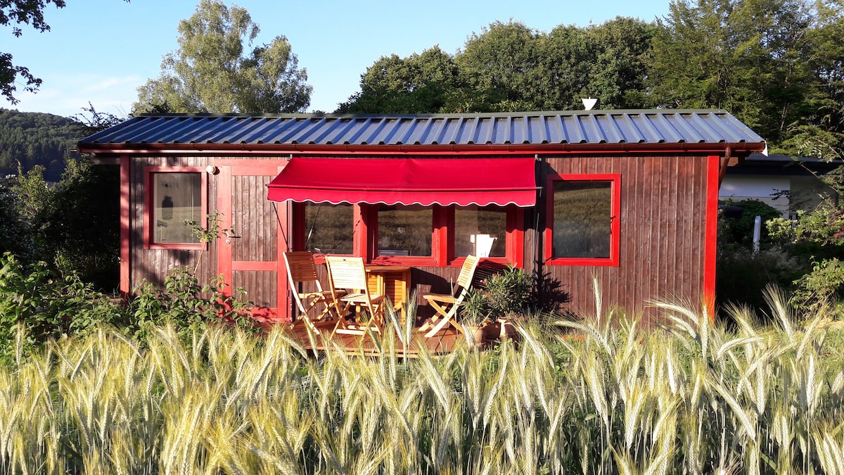 In der umgebauten Sauna schlafen 2 Personen gemütlich und bequem. Dusche und Toilette sind exclusiv nur für unsere Gäste ca 10m über den Hof. Das "Hotel" liegt nur wenige Schritte vom Wanderweg Höhenflug entfernt. Die Autobahn A 45 ist hinter dem Berg nur 3min entfernt. Das Saunahotel ist nicht mehr nutzbar als Sauna.