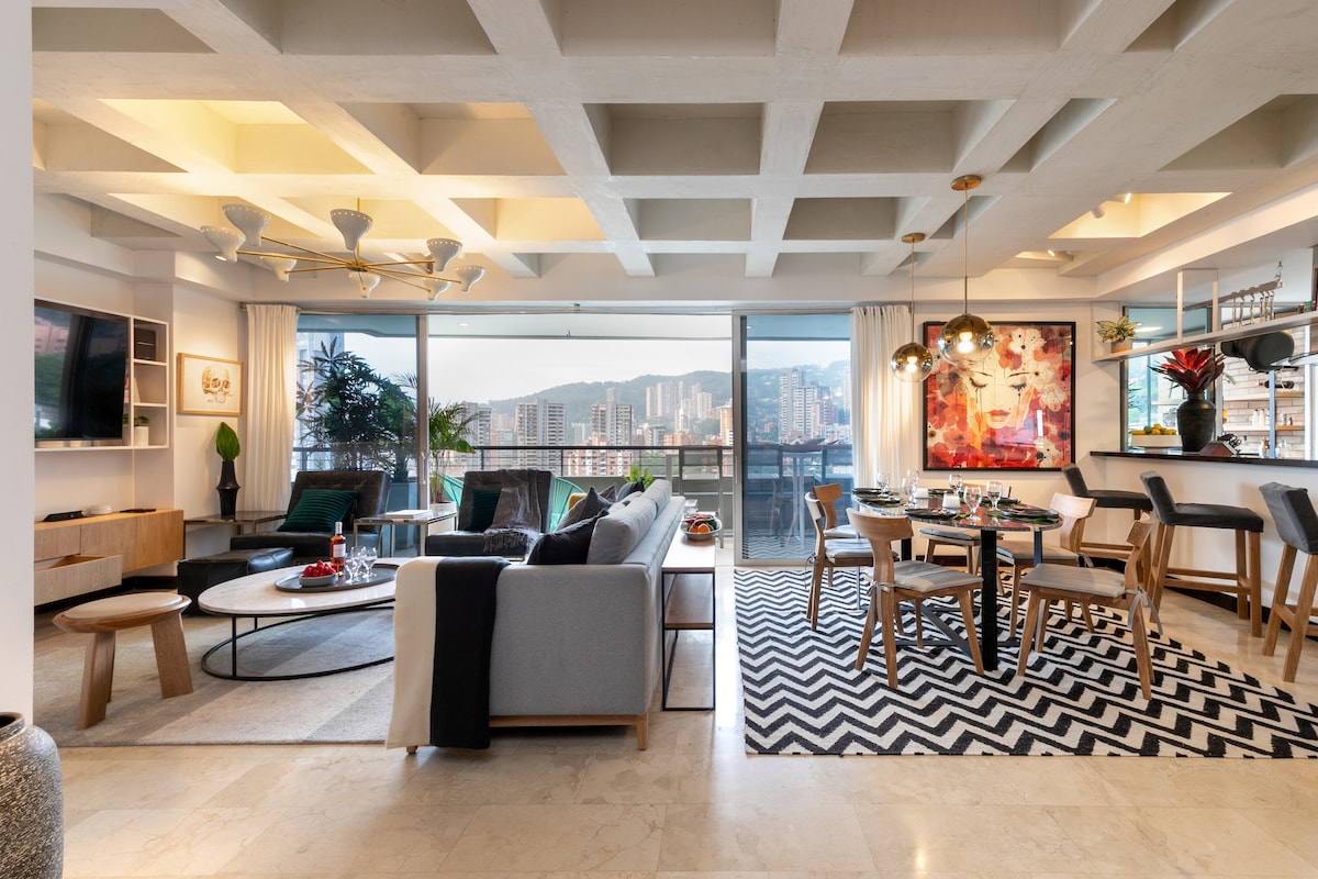 RECENTLY RENOVATED -High-speed internet great for remote work -Brand new A/C -Fully renovated Industrial design apartment -King size bed -Breathtaking views of Medellín (trust me, worthwhile to stay here) -19th floor -Unbeatable location in Poblado near to Provenza and Lleras Park -Modern amenities -Spacious living area -Smart TV x 2 -Fully equipped kitchen -Washer & Dryer Tower -Pool -Gym -Coworking space -Restaurant inside the building -Private parking -Self check-in -24/7 Security