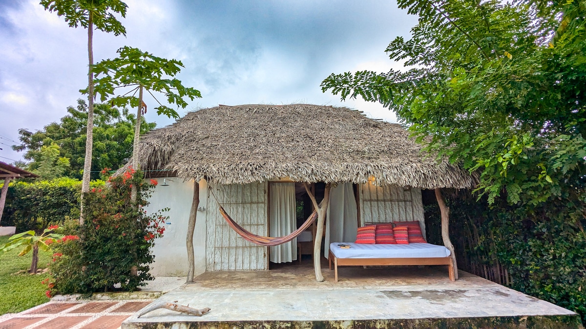 Cabaña inspirada en la cultura wayuú, inmersa en un entorno verde donde se encuentran otras 2 cabañas/habitaciones y un amplio y cómodo kiosco para el encuentro, kiosco desde donde se puede divisar el mar caribe que se encuentra a solo 2 minutos caminando y también con vista a la Sierra Nevada de Santa Marta. Con la opción de privacidad o de socializar con los demás huéspedes. Propicia el descanso, acceso a hermosos parajes y servicios como restaurantes y tiendas de comestibles.