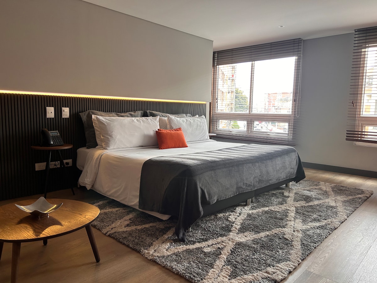 This place is not to be missed. We have 1 bedroom 1 bathroom with a jacuzzi. A fully equipped open kitchen concept. High Ceilings. modern light decor and a 55'' HD TV. This hotel is perfectly located within 2 blocks of Parque Lleras. Within a few mins walk from the best Restaurants in Medellin like Carmen, El Cielo and Hanami. If you want to be in the heart of the action where the locals hang out this is the place to be. Everything you need is at a few steps reach.