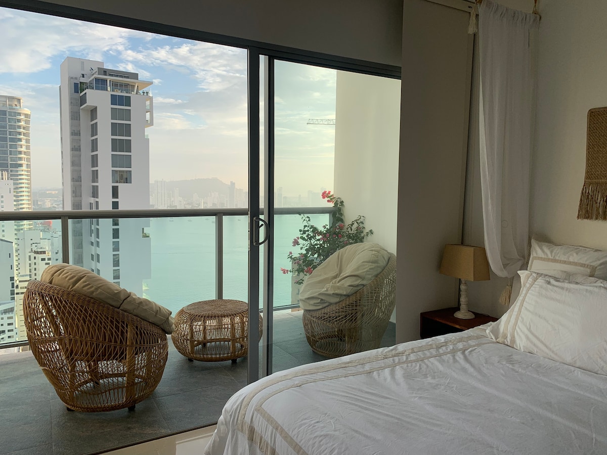 Exclusive 30th floor apartment Morros City with incredible and captivating sea and historic center views. Master bedroom with direct sea view and balcony access. Full kitchen, 2-in-1 washer and dryer, 60" Smart TV, 500MB fiber optic WiFi. Beachfront Bocagrande with luxury amenities: pool, jacuzzi, Turkish bath and gym. Free parking. Ideal for couples seeking the most exclusive experience from the highest available floor in all Cartagena