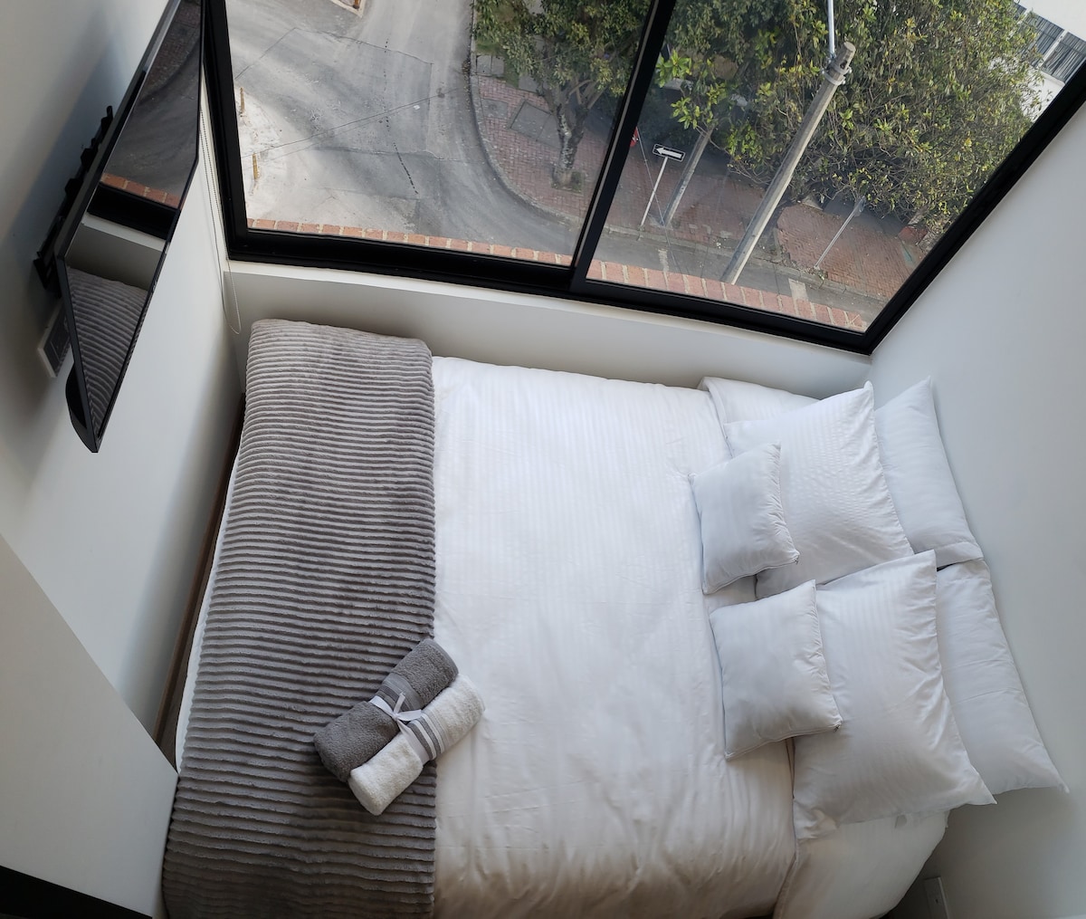 INCLUYE •Apartaestudio 18 m2, vista a calle •Wifi, smart TV •Gym, azotea ¡bella vista! •Coworking, Wifi •Baño privado, agua caliente, toallas, espejo. •Cocina equipada, mini refrigerador, microondas •Set de ollas, platos, cubiertos, copas •Lavandería pagada •Ubicado: calle 62 con 3. Chapinero •Céntrico, cera a La Candelaria, Monserrate, Museo Botero, Plaza de Mercado de Paloquemao •Zona tranquila, supermecado 24x7, restaurantes, bares, cafés NO INCLUYE •Parqueadero. Hay a los alrededores