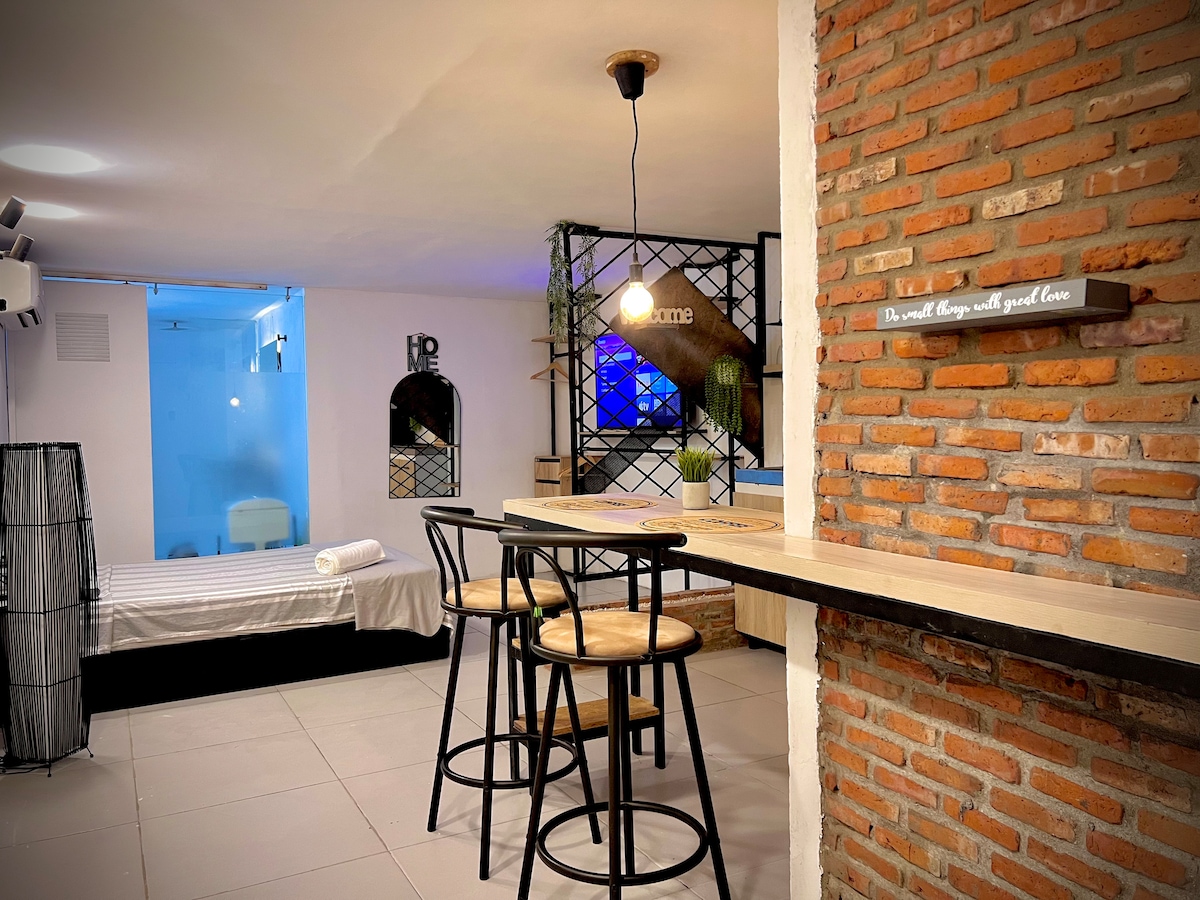 Suite completamente amoblada de 28 m2, con aire acondicionado y cocineta. Ubicada en una de las mejores zonas de Medellín, en un barrio muy tranquilo y cerca de todos los sitos de interés. La Suite cuenta con una vista espectacular a la ciudad y a las montañas. Podrás hacer uso de la zona de coworking, gimnasio y un espectacular café que ofrece diferentes tipos de bebidas a base del mejor café colombiano, podrás disfrutar de tu bebida en la terraza que se encuentran en el 2do piso del edificio.