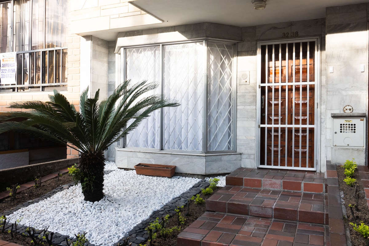 Our comfortable one bedroom apart-studio, interior location with windows towards a garage, and to a courtyard, bohemian, minimalist, with a small garden has a true city feeling! It comfortably accommodates four people and it´s centrally located on a street, with easy access to Simon Bolivar Metropolitan Park. Enjoy a complete kitchen, and access to Transmilenio. This space is ideal for two people; however, we provide a high quality sofa bed for two more people should the need arise. Hot water