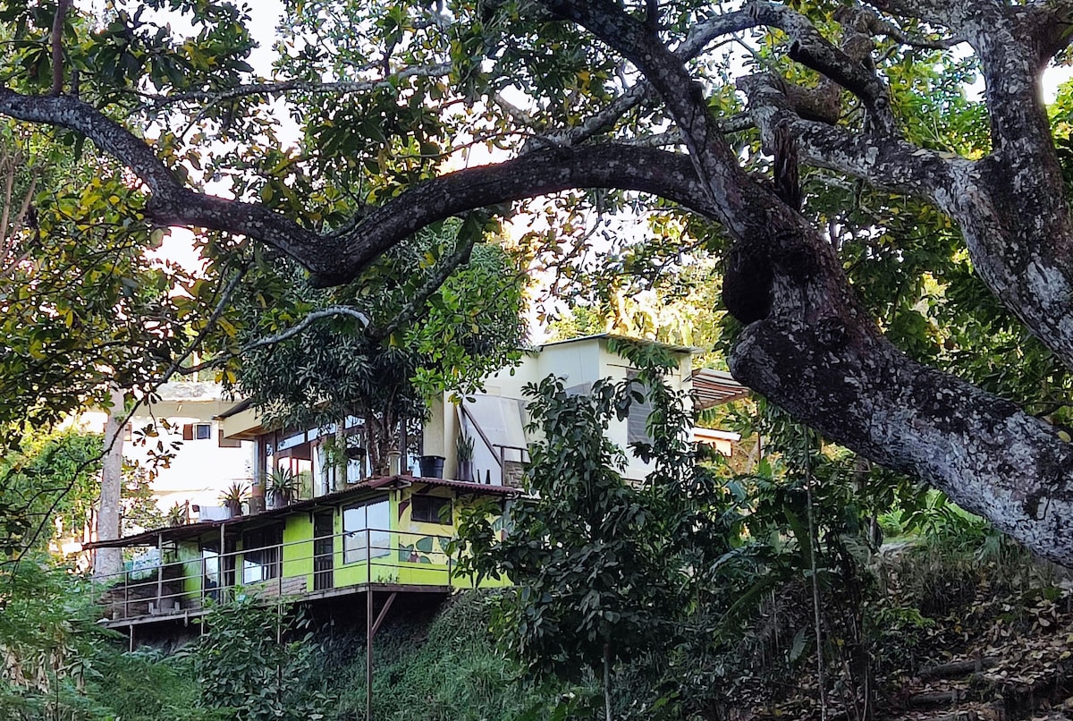 Cabaña privada rodeada de naturaleza. Gran terraza y vistas al bosque tropical y a cañada con variedad de pájaros y flora. Caracolíes (árboles) gigantes para abrazar. Increíble vista a los cerros. Hermoso lugar donde escucharás los sonidos sanadores de la jungla. Reconectarás con la naturaleza, sus ritmos y colores. Amanecer y crepúsculo sobrecogedores. Un árbol de mango vive en el baño. Ubicación privilegiada, todo a pie: el río, el pueblo, restaurantes. Genial para avistamiento de aves.