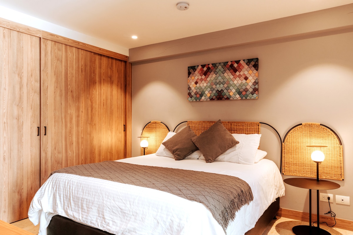 Let yourself be captivated by the serenity of our charming apartment, where the bedroom offers views of a quiet, sunlit street. Featuring a design that seamlessly integrates the living room, kitchen, and dining area into an open and welcoming space, the apartment is known for its warm and bright ambiance. Located just a few meters from the Hilton, JW Marriott, and Four Seasons hotels, in the heart of Quinta Camacho and Zona G, you'll have access to restaurants, cafés, and bars.