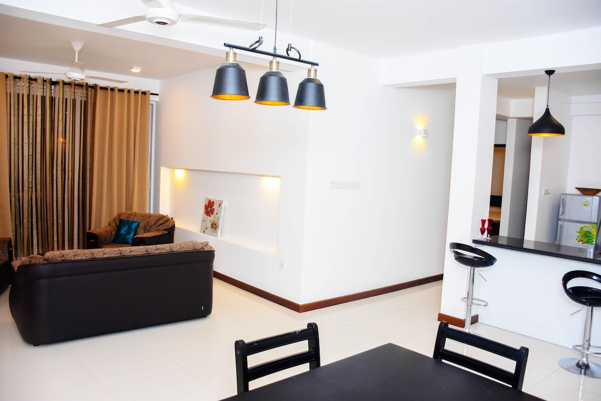 Beach Staycation Executive Luxury Flat, 180° panoramic view of the glistening Indian Ocean and Colombo coastline. The flat is 15 -20 mins to downtown Colombo and a 2 minute walk to the beach over the train tracks. The apartment building offers access a rooftop pool & 24/7 security. Our two-bedroom, three beds - suited to Family with up to 3 children, Master-King Bed & En-suite, Bed 2- Queen and loft single bed. Guest bathroom. Your Host is A Superhost. Not suited for very young children.