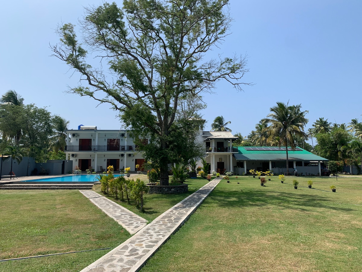 Escape to Keera Villa, a tranquil 2-bedroom retreat perfect for up to 4 guests, just 20 minutes from Katunayake Airport and 5 minutes from the highway entrance. Featuring a king bed, two single beds, two washrooms, a fully equipped kitchen, and in-unit laundry. Each bedroom has a 43" Smart TV, Wi-Fi is included, and air conditioning ensures your comfort. Set in a serene environment surrounded by lush fruit trees and peaceful farm animals, enjoy the private pool for a relaxing stay.