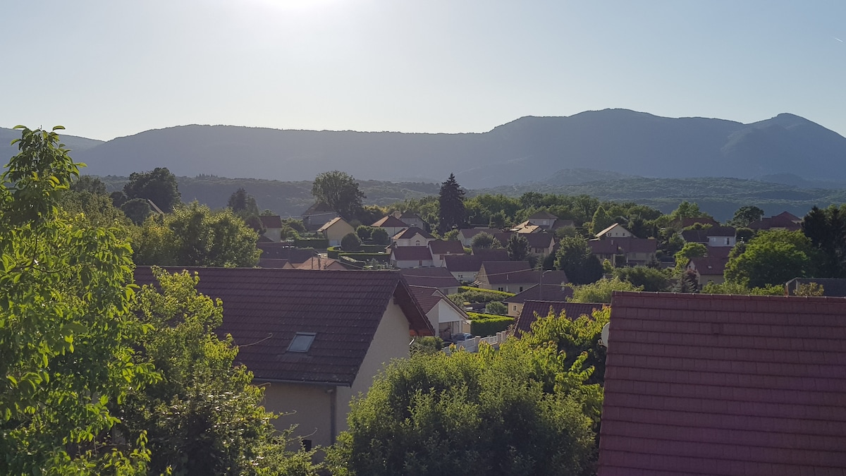 Petit CHALET en madriers massifs de montagne plain-pied, au calme, dans le verger de pommes au cœur de la douceur du Bugey...ses villages, vignobles, cascades et lacs. Cuisine/SDB privées. Vue dégagée sur le Colombier -La Dent du chat et le Mont Blanc, dans une immense propriété VUE à 360 degrés ! Tout confort pour un couple. Linge de maison, de toilette et de lit fournis.. Coeur de ville 15 minutes à pieds. À votre disposition pour un BEAU SÉJOUR fruits du verger, jus de pomme et légumes.