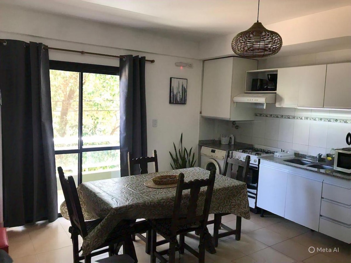 @apart.enjoy - Disfrutá de una estadía con estilo moderno, buen wifi, smart tv, una cocina equipada a full para los mejores desayunos, estacionamiento propio, parrilla, mini piscina y jardín para relajarse. De día aventuras y por la noche, tenes la opción de prender leña en el fogón y crear momentos únicos. Ideal para familias con hijos mayores de 10 años (por la escalera), ya que cuenta con la habitación principal en planta alta y baño completo en suite que brinda mucha privacidad.