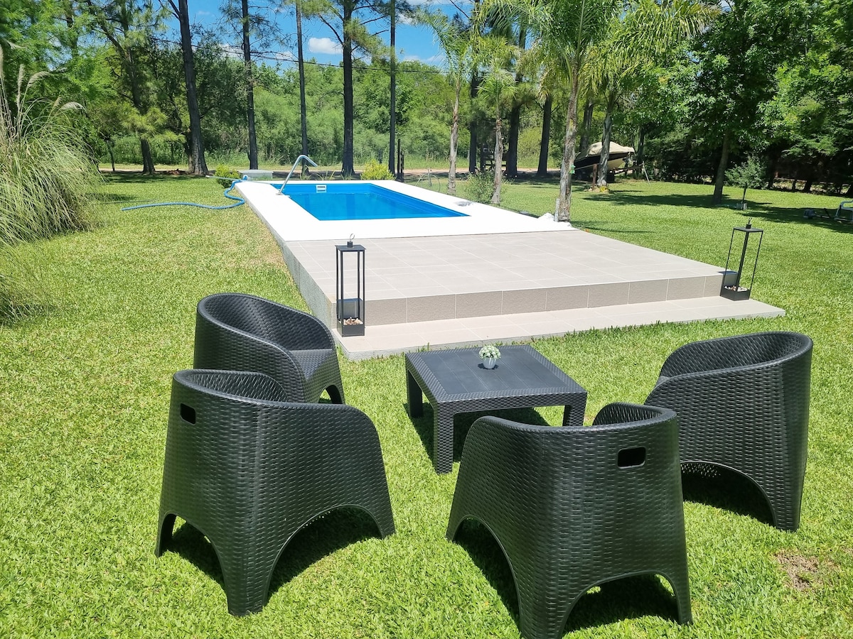 Relájate, Respira, Disfruta. Escapa del bullicio y sumérgete en un entorno de paz y armonía, rodeado por la naturaleza y el silencio. Nuestro amplio parque verde y la piscina te ofrecen el espacio perfecto para relajarte y disfrutar de una estancia tranquila y cómoda. Ubicada en las afueras de Colón, cerca de la Ruta 135, nuestra cabaña es el refugio ideal para quienes viajan en auto y buscan un lugar apartado y accesible. Parque y pileta compartidos ( 6 personas máximo). Toallas no incluidas.