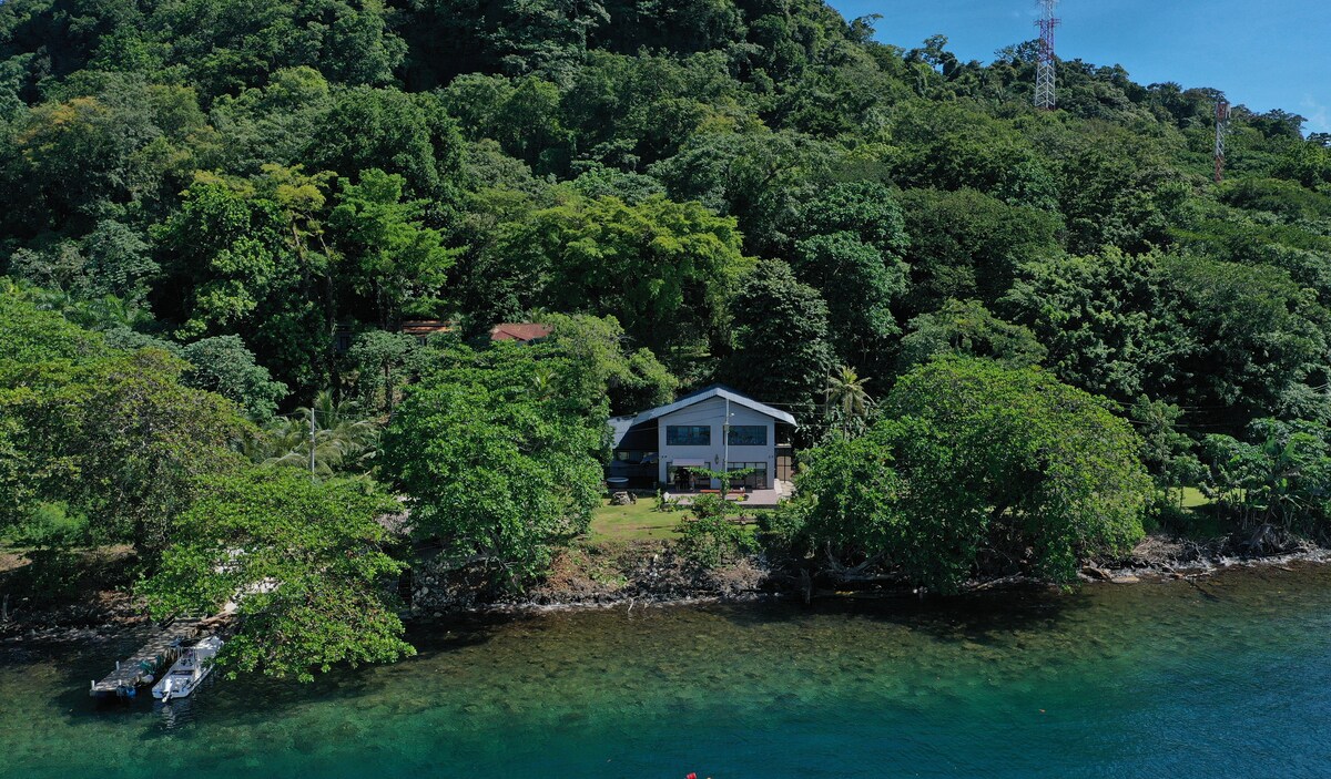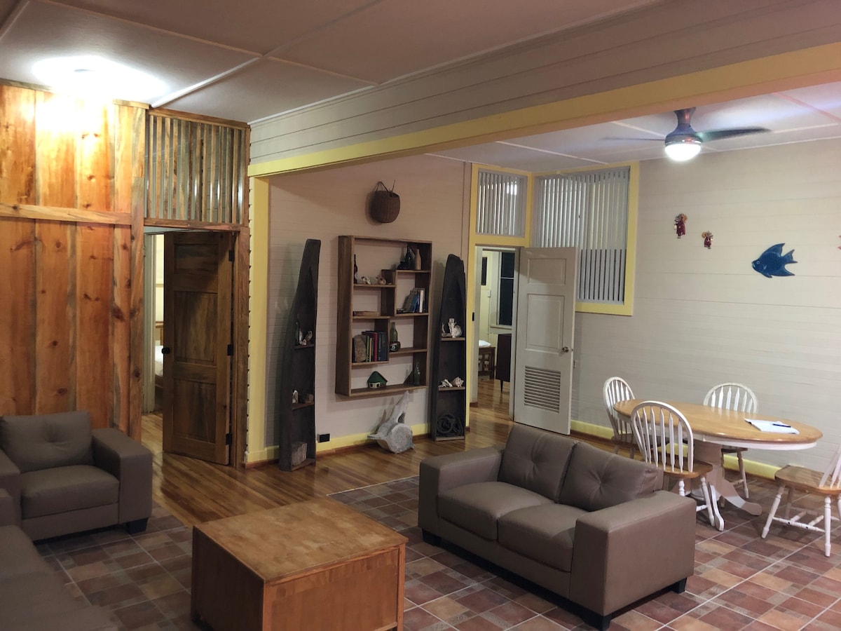 Our restored canal zone home sits on a cul-de-sac in historic Gamboa. It is surrounded by trees and overlooks the town with Panama Canal and passing ships in the distance. An original Damon Kyllo mural adorns one large wall. You will love the balcony, high ceilings, artwork, breezes, and the cacophony of frogs, monkeys, and parrots. This is a great place for birdwatchers and a starting point for exploring the Panama Canal, Soberanía National Park, and the Chagres River.