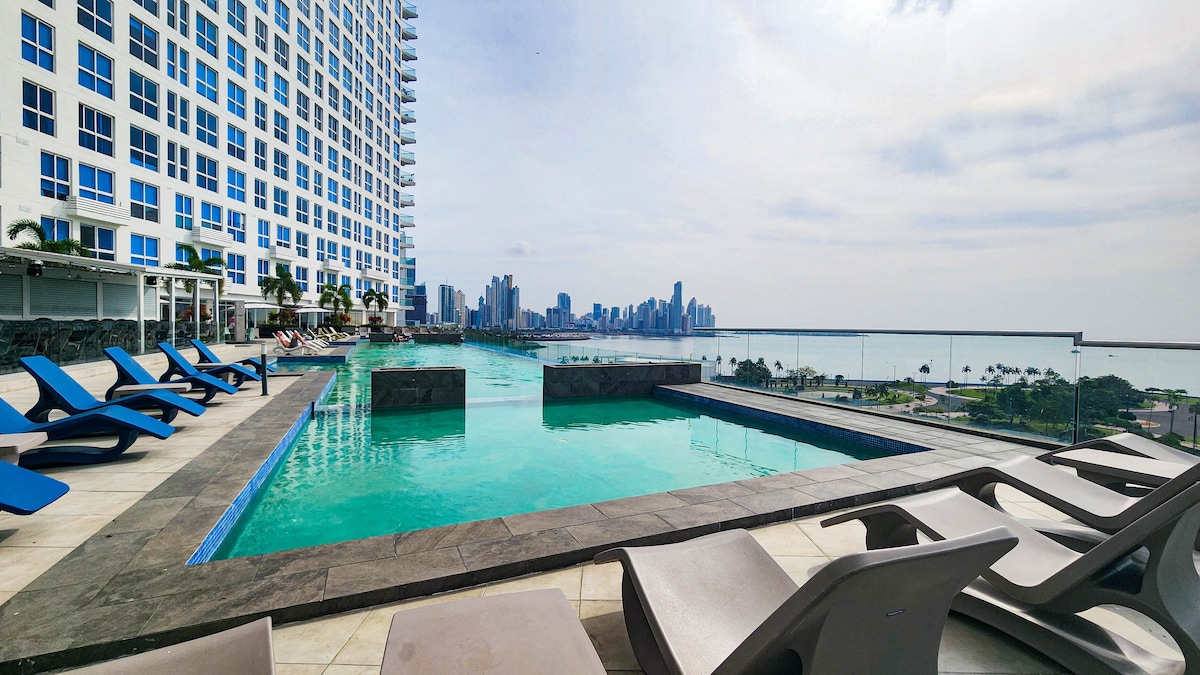 Experience luxury in this oceanfront 1-bedroom apartment on Balboa Avenue with stunning views of the Pacific Ocean, Casco Viejo, and modern Panama City. Fully equipped for long stays with A/C, Water, TV, cable, and WiFi. Located in a unique building with amenities like Poin, a zipline between buildings, plus restaurants like Cielo, Osaka, and Patria. Walk to Cinta Costera and a subway station. Everything you need is right here—your perfect Panama getaway!