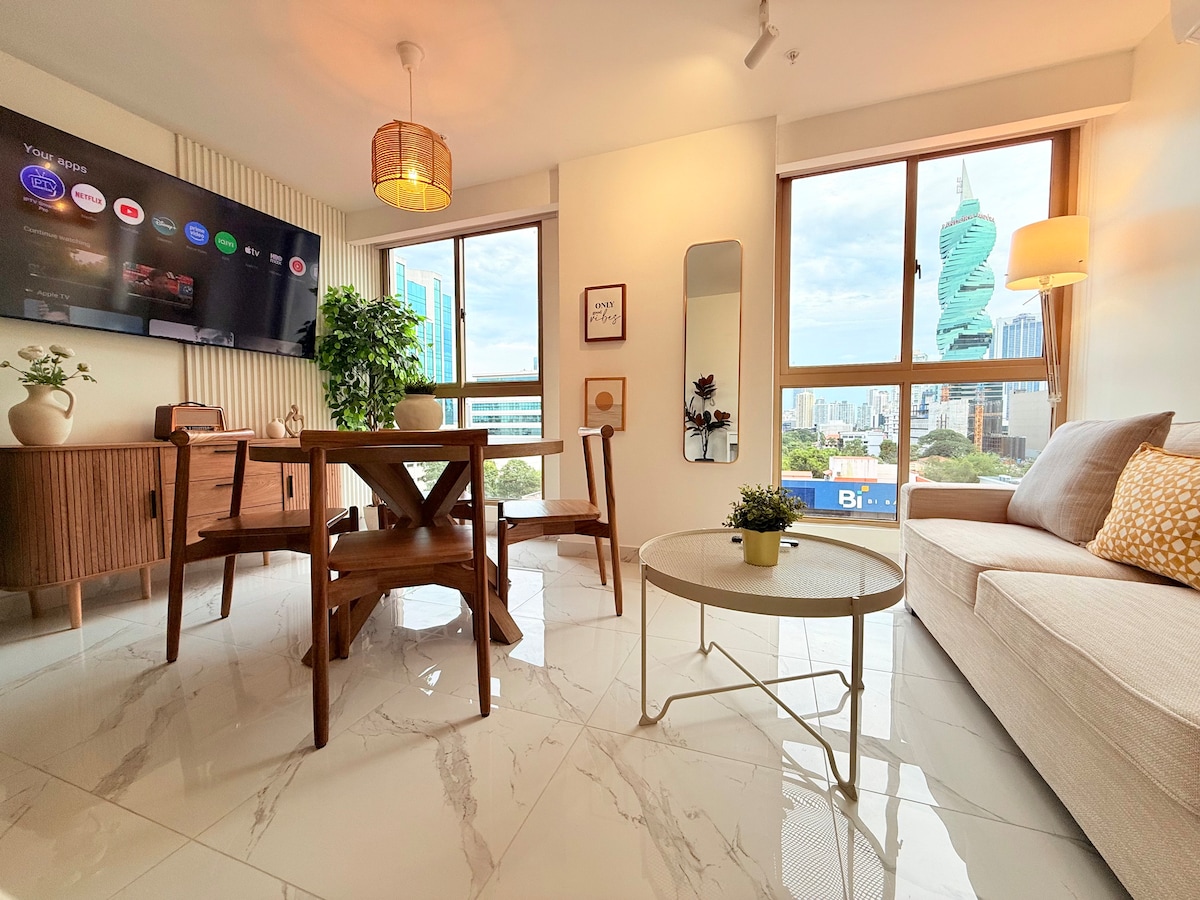 Alojamiento con la mejor vista al mar de Panamá, Edificio Yoo & Arts, 130mts podrás disfrutar de varios ambientes durante tu estadía, desayunar en nuestro balcón con una excepcional vista al mar, ver el amanecer desde tu dormitorio, o incluso trabajar en un exelente ambiente. Podrás tener fácil acceso a restaurantes de alta cocina en el mismo edificio del alojamiento, supermercados cerca, centros comerciales. El lujo te acompañará ya que el edificio es uno de los más exclusivos de la zona.