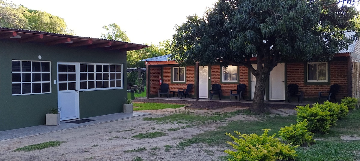 House with private dock facing the Iberá Lagoon, perfect for watching sunsets, wildlife, and enjoying moments of calm by the fire pit. Accommodates up to 4 guests, with two small but comfortable bedrooms, hot/cold air conditioning, a fully equipped kitchen, and a living area with direct views of the wetlands. Screened barbecue area, Wi-Fi, and private parking. Nature, privacy, and rest.