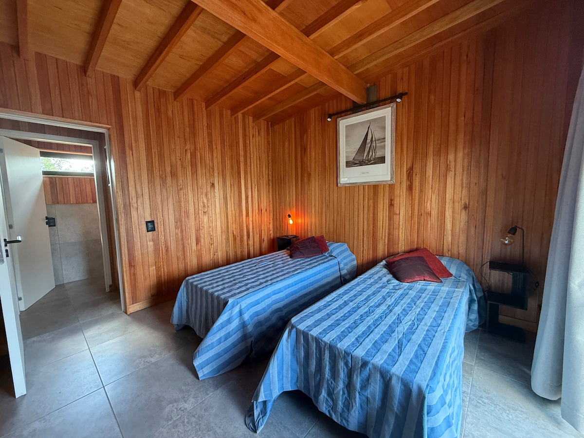Vivi el campo y el mar a 400 metros de la playa Cruz del Sur. Disfrutá de un entorno natural y relajante. Se trata de una casa modular que construimos para disfrutar en familia y que decidimos alquilar en épocas de año en las que no la usamos. Posee un dormitorio con cama matrimonial que puede transformarse en 2 singles, una cocina totalmente equipada y un living con sillones y salamandra para la cual dejamos leña disponible. En el dormitorio hay una estufa. Cuenta con servicio de wifi.