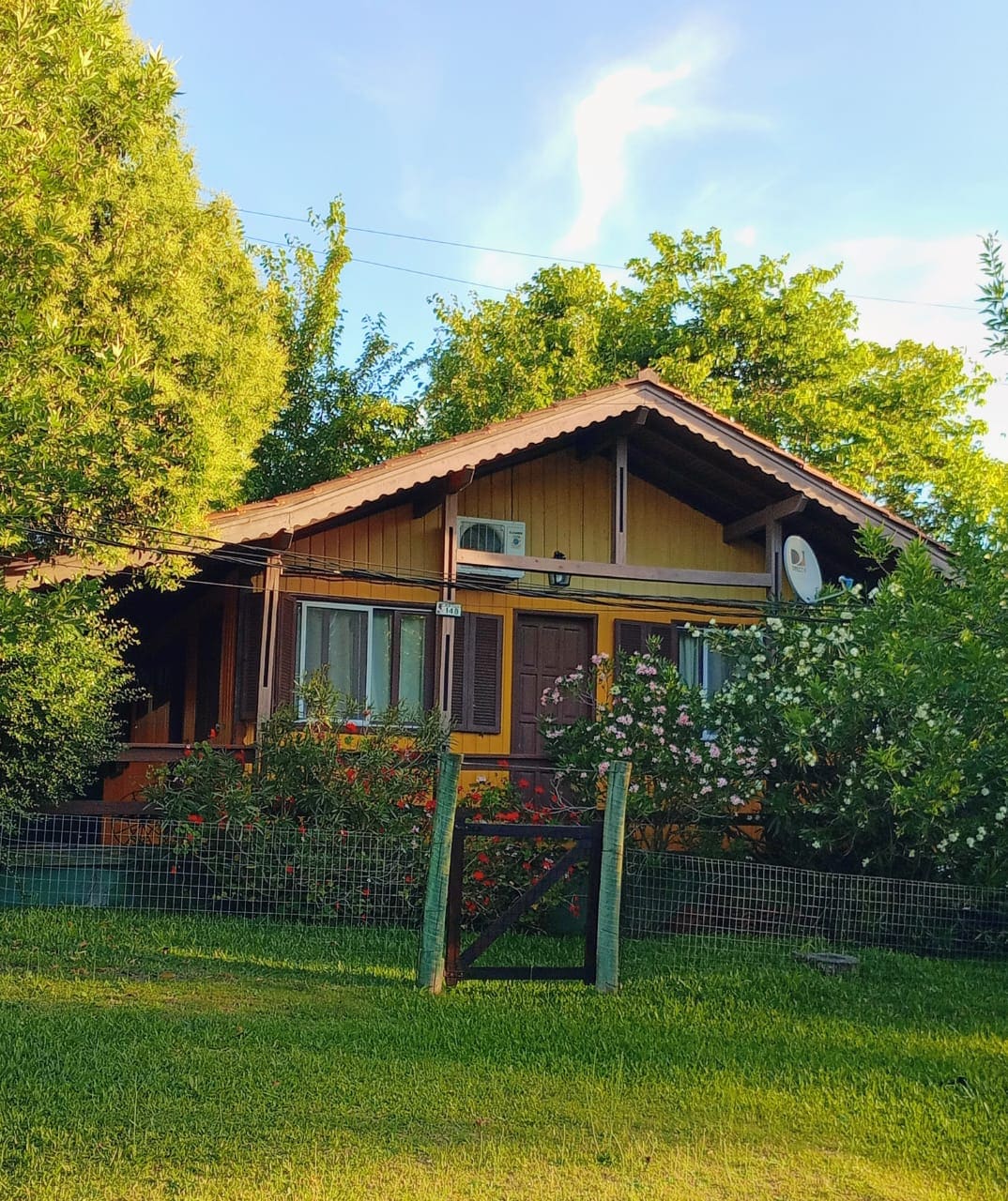 La cabaña consta de tres dormitorios y dos baños, uno en suite. Posee un deck al frente y, al costado, un jardín propio de 180m2. El deck es un ámbito propicio para ser disfrutado, descansando en las reposeras existentes o en un asado que junta la cercanía de la parrilla, el jardín y la sombra de la galería amplia de tejas permitiendo un agradable estar a los huéspedes. La cocina tiene puerta de salida al deck y se integra con un desayunador al comedor y al living con su tv Smart .