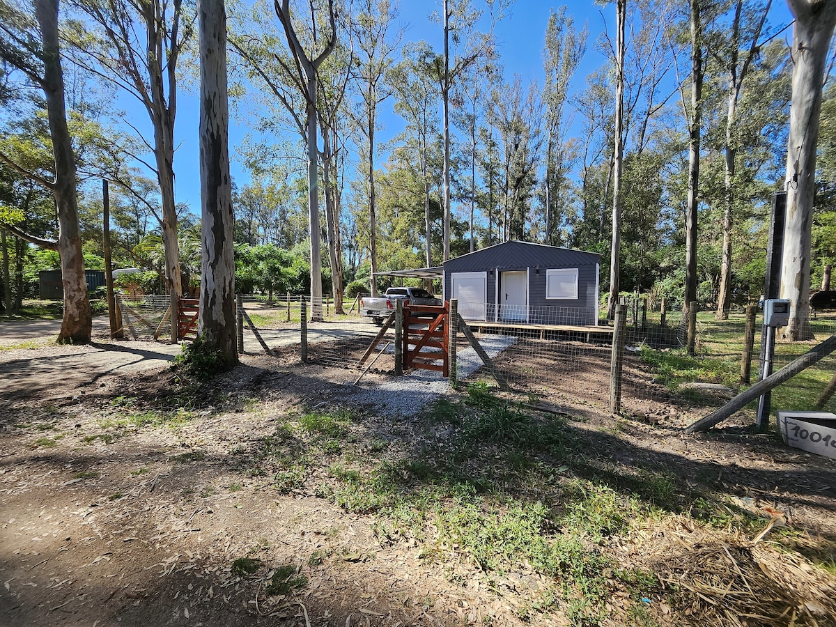 Hermosa cabaña nueva, totalmente equipada, confortable, cálida. En una excelente combinación entre bosque y playa. Rodeada de naturaleza. Ideal para descansar y desconectarse en silencio y armonía. Es perfecto para realizar caminatas o paseos en bicicleta, cuenta con 2 bicis. Con Wifi y Smart tv. A 20 minutos de Colonia y a 2 hrs de Montev. Bus local o a 3 km de R 1. Posibilidad de traslado en auto desde Colonia o ruta gratis coordinando con nuestros horarios disponible NO es un contenedor.