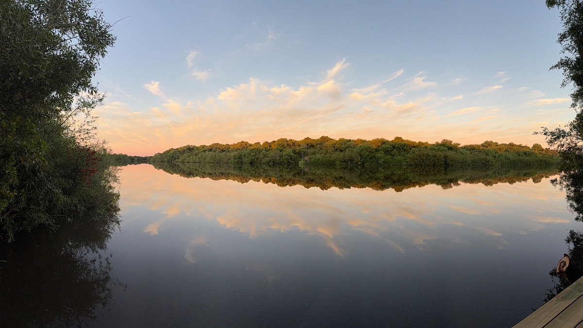 Un espacio único en medio de la nada. En el pueblo de Riachuelo, a solo 12 km de la ciudad de Colonia del Sacramento. 40m² de confort con todo lo necesario para un descanso absoluto en un predio de 5 hectáreas. Playita frente al arroyo donde si quieres puede nadar, pescar y si traes un kayak disfrutar el lugar a pleno. Pesca recreativa. Parrilla. Avistaje de pájaros. Piscina.