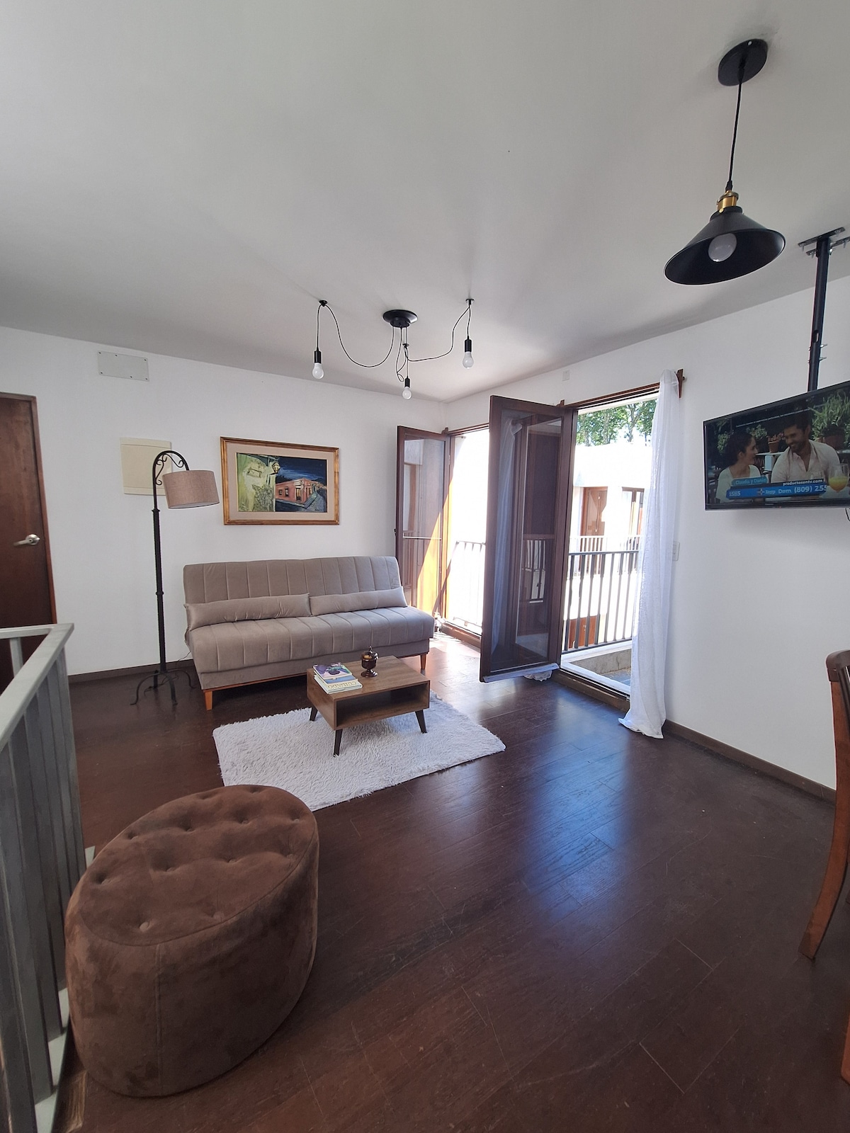 Apartamento "2" dentro de la antigua casona "El Patio de las Glicinas" totalmente reciclada. Loft con living y cocina integrados, y dormitorio en el piso superior. Ideal para parejas. Zona muy tranquila, segura y silenciosa frente a la plaza y cerca de tiendas y bancos, a pocas cuadras del barrio histórico y a una cuadra de la playa. Totalmente amueblado, con aire acondicionado en ambas plantas, televisor con reproductor Chromecast y cocina equipada con horno, microondas, cafetera y tostadora.