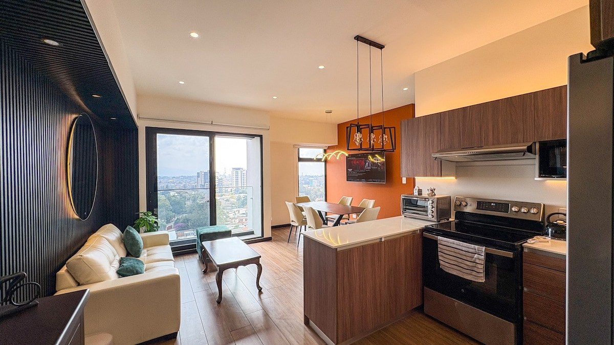 Stay at the top of Guatemala City in Altaire, the city's tallest building! This modern 2 bedroom apartment offers breathtaking views, a rooftop lounge, pool & gym. Parking available! Perfect for couples, families, or business travelers, it features high-speed WiFi, a full kitchen, and secure parking. Experience a unique, luxurious getaway in a prime location.
