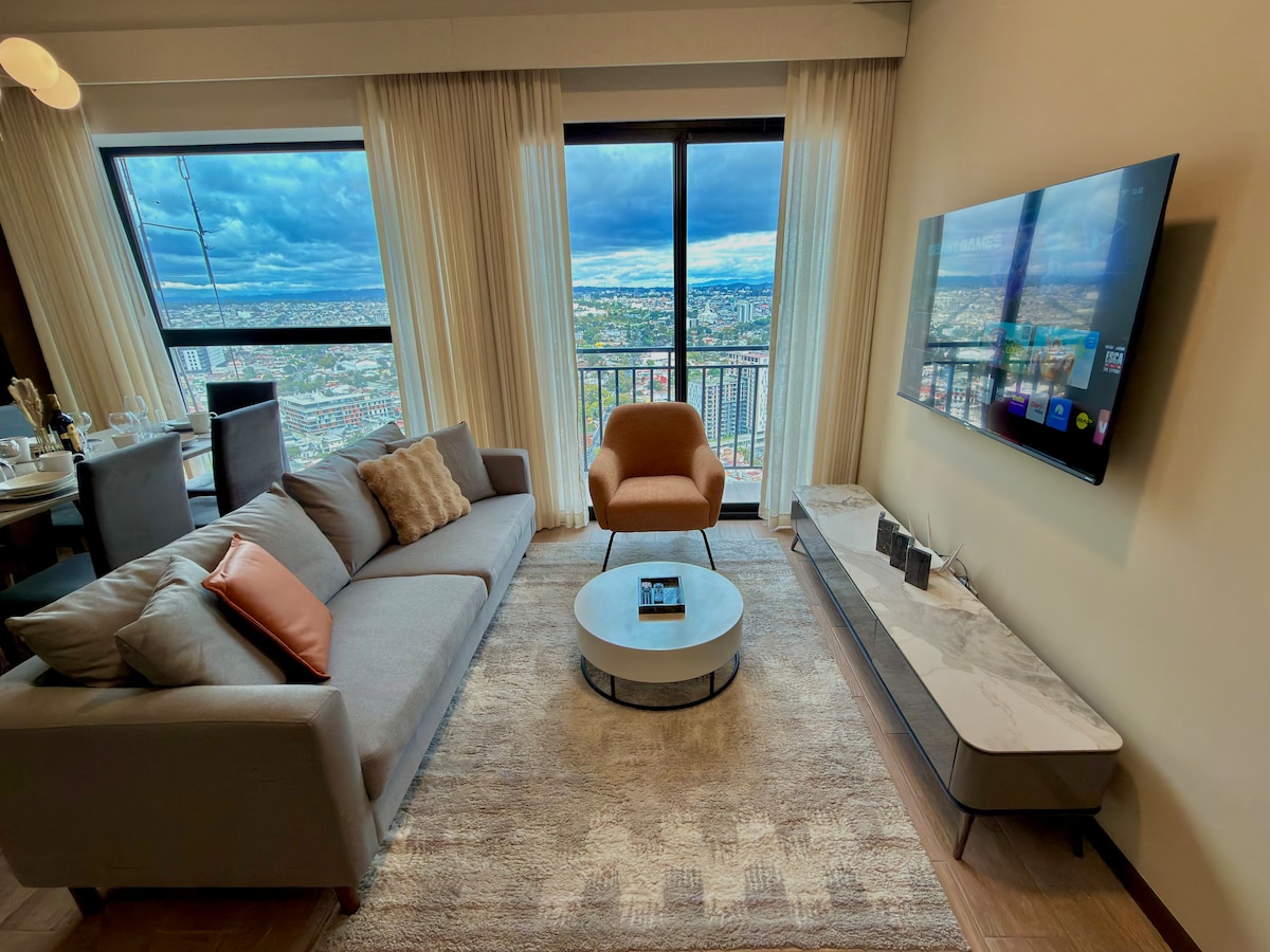Vive la experiencia de lujo en las alturas de la ciudad. Este elegante apartamento con vistas panorámicas inigualables hacia los volcanes. Disfruta de una aventura exclusiva con una piscina climatizada y un ambiente cálido y acogedor. Ubicado estratégicamente cerca del aeropuerto y de las principales zonas turísticas de la Ciudad, es la opción ideal para quienes buscan comodidad, privacidad y una estancia inolvidable.