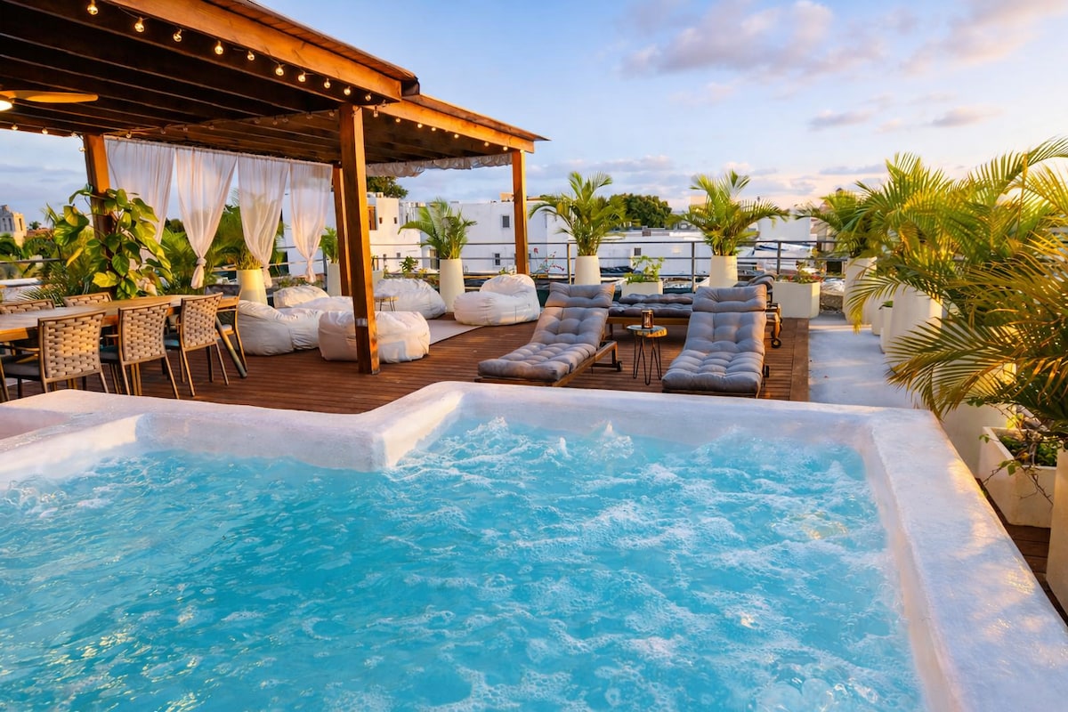 Sunbathe or chill out in a hanging chair, slip into the totally private rooftop Jacuzzi after sunset and gaze at the stars The jacuzzi size pool is cold water only....a refreshing option in the tropical heat. The apartment is on a quiet street near the cathedral and Parque Duarte in easy walking distance to historical sights, restaurants, bars, and cultural attractions. There is free street parking, we strongly recommend to leave the car at one of the guarded parking options nearby at night.