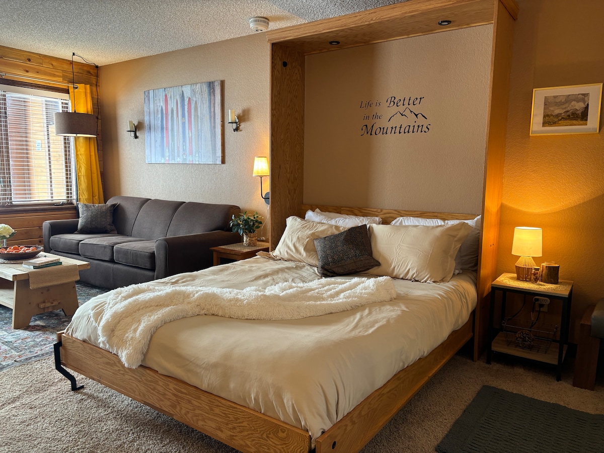 Immerse yourself in the wilderness of the Evergreen Rocky Mountains, yet still within reach of civilization. This tiny house cabin is nestled inside a forest and aspen grove, along a running stream. Curl up . Retreat to comfort and luxury, curled up on our uniquely designed window bench overlooking the scenery with a good book, cozy movie, and enjoy our custom dry sauna a window view as well. A tiny home in the midst of breathtaking views, fresh air, and serene nature.