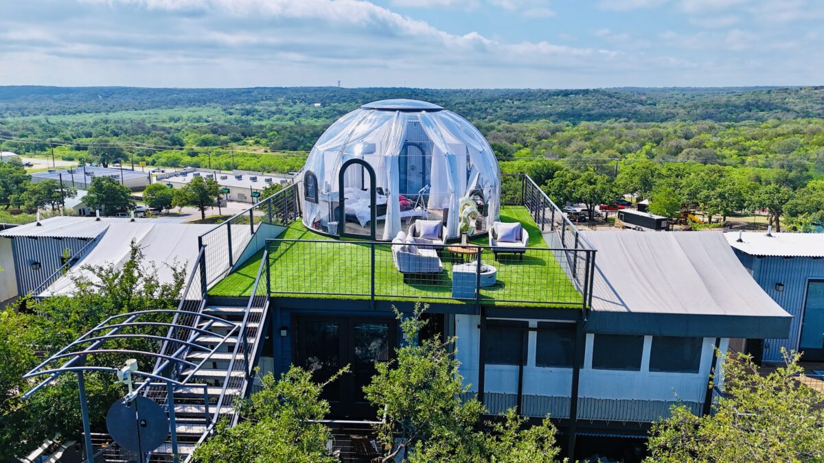 The Cedars Ranch is a stunning glamping resort and event venue on 20 acres in the heart of Texas Hill Country. Amenities include a resort-style pool with cabanas, pickleball courts, bocce ball, walking paths, outdoor games, and more! Spherical dome one-bedroom suite with huge panoramic curved window allowing guests to lie in bed and view the natural scenery without leaving their cozy home. King bed on the main floor, additional queen bed in the loft, small kitchenette, and full bathroom.