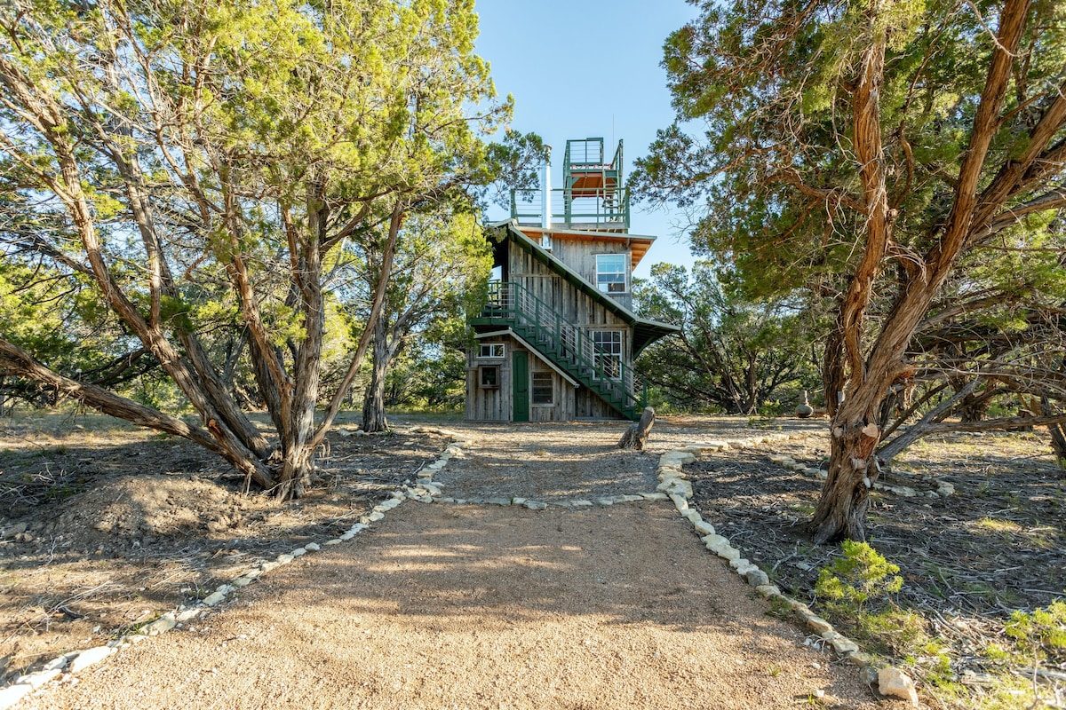Explore an expansive viewpoint of the Texas Hill Country. This handbuilt, one-of-a-kind treehouse is nestled on 37 forested acres. With its unique design and stylish interiors, half mile hiking trail, hammocks, and screened in porch, the treehouse invites you unwind, rest, and recharge in nature. You won’t be surrounded by other Airbnbs here. Book a night or two and enjoy some peace. (The covered outside staircase takes you from the downstairs kitchen/bathroom to the 2nd floor bedroom.)