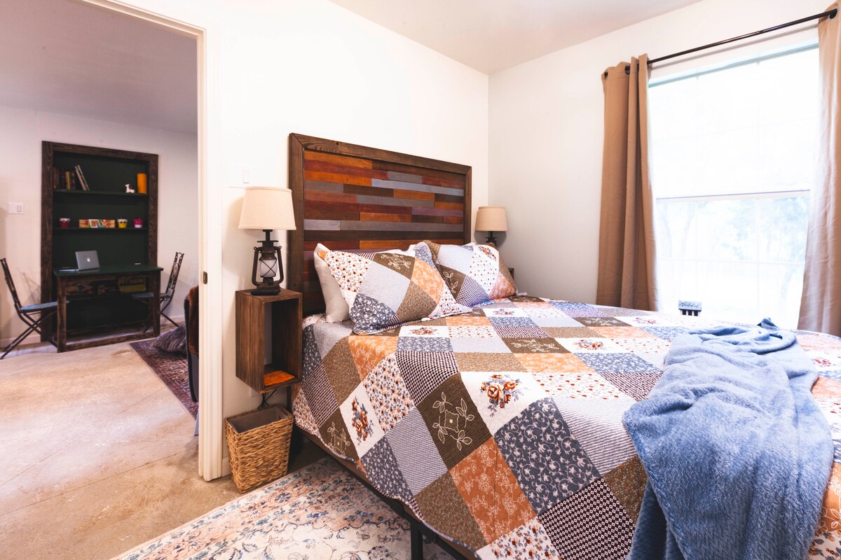The conveniences of home and the luxury of a hotel. Whether you are here for work, visiting family, taking a vacation, or needing to be near Dallas, our goal is for you to have the best Airbnb experience ever! Near downtown Ennis and 45 minutes to DFW, this new one-bedroom guest cottage includes a fully equipped kitchen and bathroom, living room with smart TV, office space, laundry room, and attached garage! With full use of pool, jacuzzi, gym, grill, fire pit, and outdoor amenities!
