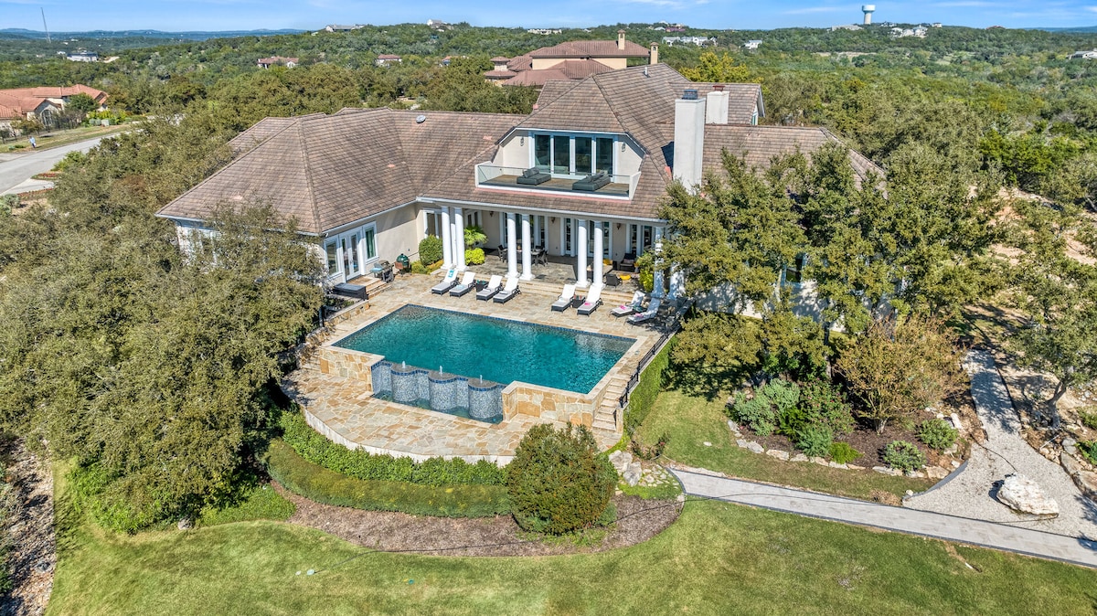 ✨ Sunset Dreams Retreat! Allows 20 people. Great for corporate offsite meetings. A one-of-a-kind luxury estate in Dripping Springs, built in '22, with a custom luxury home and separate Party Barn. With 7,300 sq. ft. of living space on 9 acres of landscaped, park-like land, it’s ideal for getaways and productive corporate retreats. ½-acre pond w/waterfall, friendly animals (mini donkey, mule, chickens), pickleball, resort pool with volleyball, spa, basketball, arcade, 2 full kitchens, 2 bars etc.