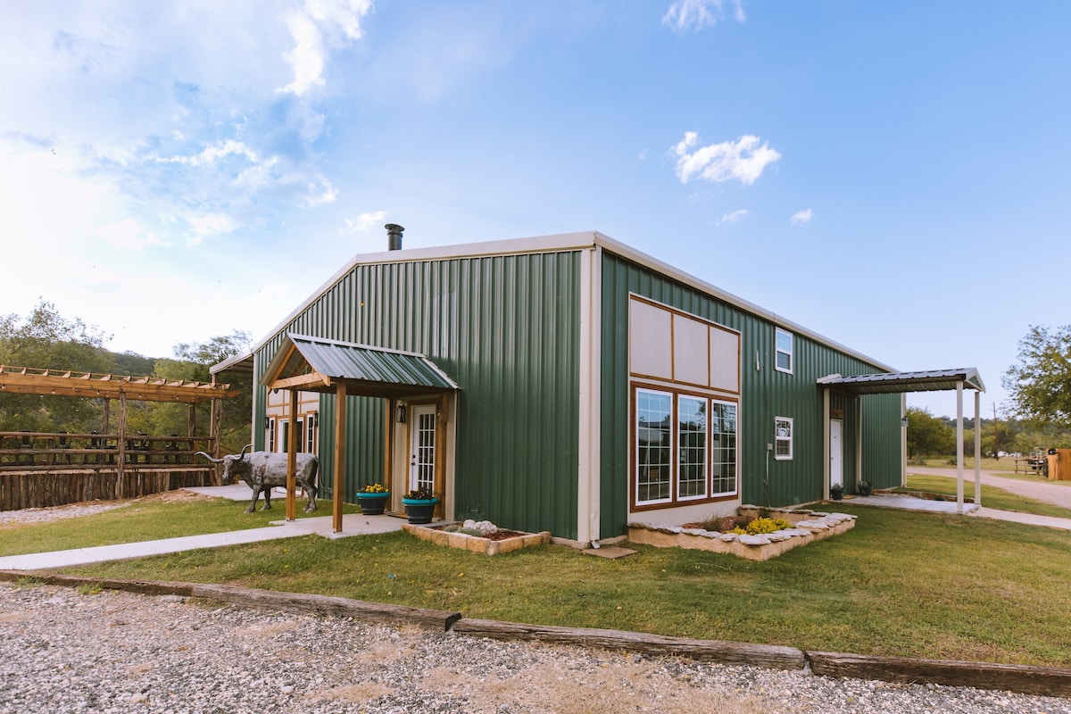 Beautiful “Hill Country Modern” home on five acres with a view of our seasonal pond and the valley. Our home incorporates the use of outdoor living space unlike any other. The patio and breezeway are integral parts of the usable space. One side of Sunrise House has a large living room with a fireplace and huge windows. The house has top-of-the-line fixtures and finishes, a mix of new and curated furniture and decor, and beautiful custom art.