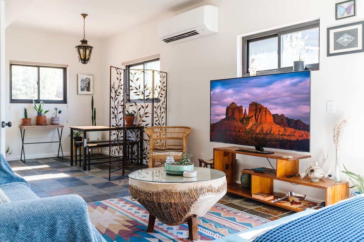 Grab the Adirondack chairs for a night of stargazing in one of only a few designated night sky communities in the country. Brimming with Southwest style, this tranquil escape offers spectacular views of the red rocks from your private Suite and private patio. Quiet and secluded guest en-suite located on 1 acre of property in an upscale neighborhood in the Village of Oak Creek, Sedona. The Suite is attached to the main part of the house with pvt entrance/pvt bath. Separated and secured by two locked doors. Private parking with keyless entry. No shared spaces. Entire Guest Suite with private entrance and bath. Outdoor patio area to relax and take in the amazing red rock views. I am available via text or phone call anytime. Or in person. This secluded, 1-acre of private property is nestled in the upscale neighborhood of the Village of Oak Creek, located nearby are over 135 Sedona hiking and biking trails. Just minutes away from Uptown Sedona, this quiet community offers quaint coffee shops and fine dining to casual eateries. The Suite is located to several famous landmarks such as Bell Rock, Cathedral Rock, Chapel of the Holy Cross, Courthouse Butte, Little Horse trail. Many other "must sees". All within minutes from here by your car as public transportation is limited. No drugs or weapons. There is a noise curfew of 10 pm. No smoking allowed on property or in Suite. No pornorgraphic, racist or sexually explicit use of Host's personal wifi will be permitted. Suite Mimosa is a charming and cozy private Suite nestled in an upscale neighborhood in the Village of Oak Creek, secluded on this beautiful 1 acre of private property you will have access to over 135 hiking and biking trails unique to the area, a community offering quaint coffee shops and fine dining to casual eateries, only minutes away from the hustle and bustle of Sedona.