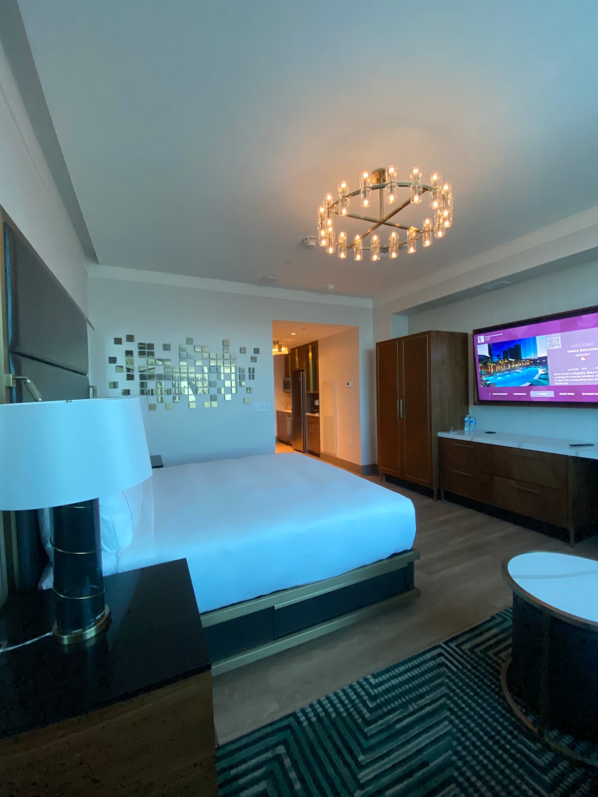 615 sq ft studio suite with king size bed and queen size sofa bed. Balcony with unobstructed mountain views on the 33rd floor. Quiet and peaceful, yet just a 10-minute drive from the Las Vegas Strip. Modern stainless steel kitchenette equipped with cookware and kitchenware. Luxurious full size marble bathroom with a jacuzzi tub. Connected to the Palms Casino featuring renowned restaurants and entertainment. Amenities include: Casino, Pool, Gym and Lobby Lounge Bar. FREE Parking and Wifi