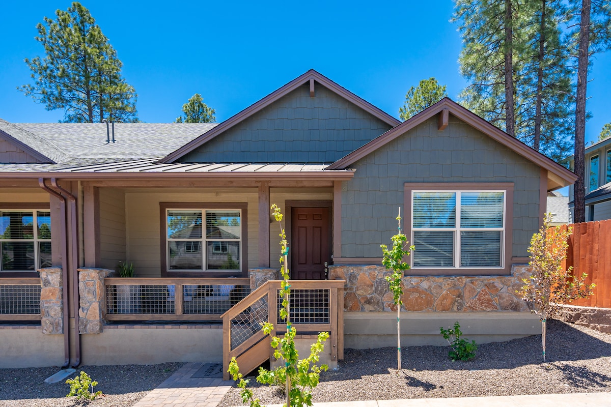 Spacious, brand new townhome in the heart of Flagstaff. Features one King bed, one Queen bed, fully stocked kitchen, walk in shower, Air-conditioning, WIFI, Cable TV, on demand hot water, washer and dryer. Relax and soak under the stars in your brand new private 5 person hot tub (recently upgraded in 2023)! Perfectly located only 7 miles from Snowbowl Ski Resort, on the way to the Grand Canyon, and only five minutes to downtown Flagstaff for great dining and entertainment.