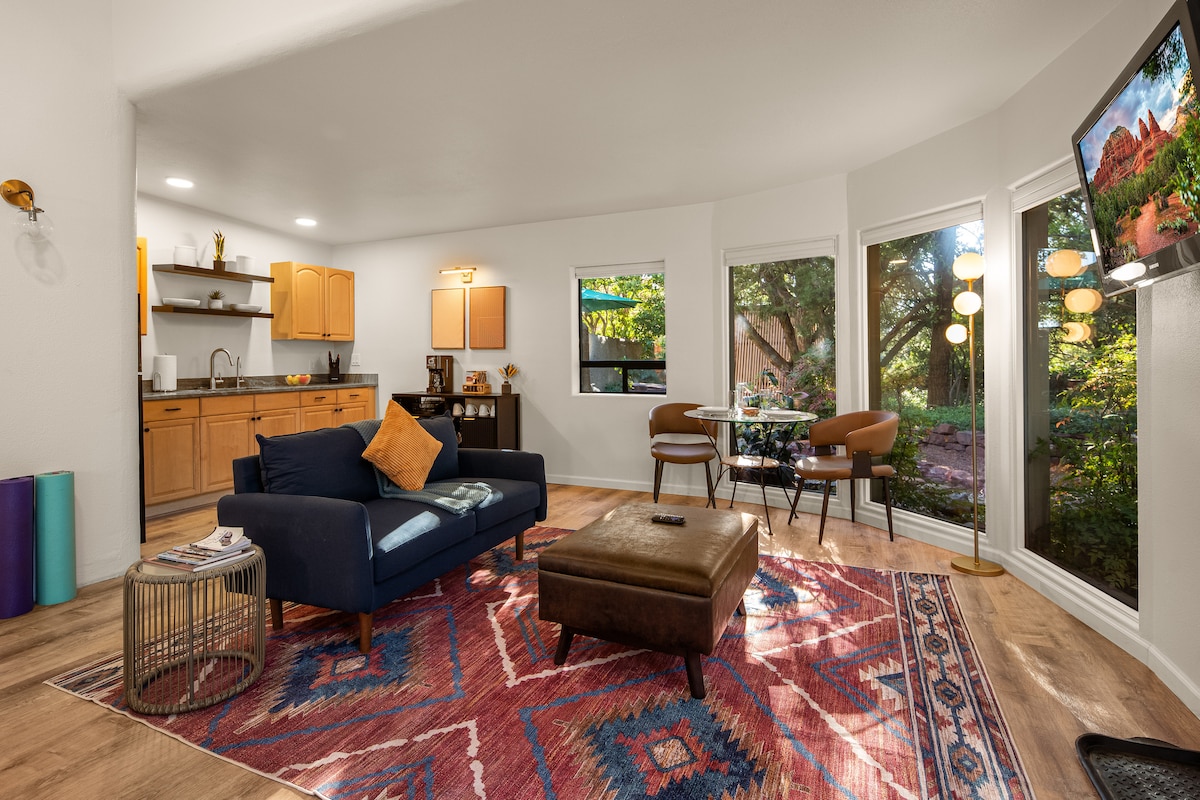 Kick back and relax in this calm, stylish space. Just minutes to hiking & mountain biking trails! Devils Bridge, Thunder Mountain, Boynton Canyon, Long Canyon and many many more. The Local Juicery is just a 7 minute walk. Out of the busy touristy area, close to Whole Foods & Natural Grocers. Quiet and tranquil with a hot tub and fire pit. The Casita sleeps 4 people with a King Sized Bed and a fold out King with memory foam mattress. There is a kitchenette with a refrigerator & microwave.
