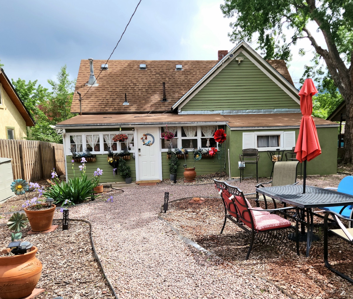 Enjoy stunning views of the sun setting behind Pikes Peak through floor-to-ceiling windows! Sip your morning coffee on the private patio as a family of deer wander by. Walk into the Garden of the Gods and then relax in the hot tub beneath the stars. Prepare a delicious meal with everything you need already provided for you; cookware, oils, and spices - and enjoy it with mountain views as your backdrop Discover your ideal Colorado Springs retreat in my lovingly renovated historic guesthouse!