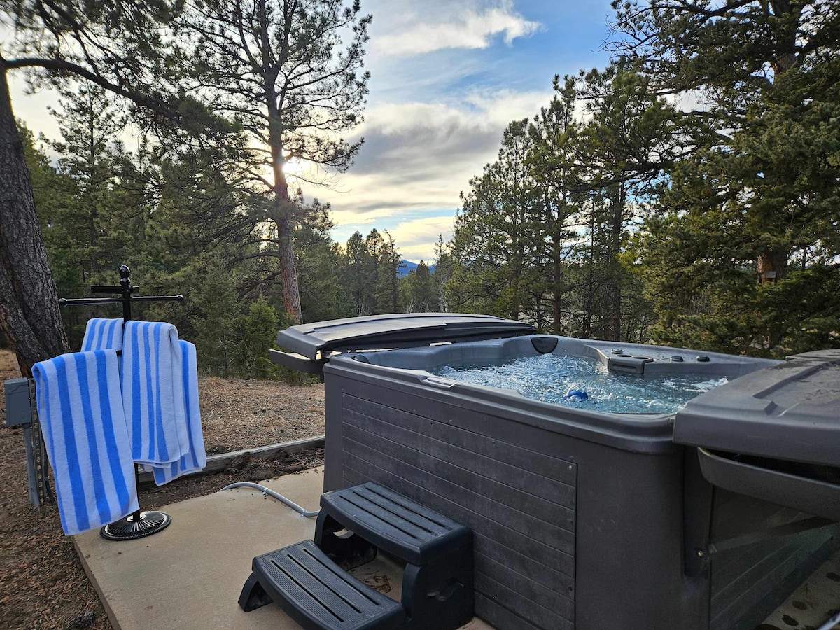 This southwestern boho cabin is tucked amongst the trees in a historic, quiet neighborhood at the foot of famed Pikes Peak. With an ample front deck, floor to ceiling windows, and a private, fenced back yard with hot tub, gas fire pit and s'more fixings waiting for you on arrival, the cabin has wonderful forest and mountain view while within 10 minutes of culture and conveniences in Manitou and Colorado Springs. The place to get away for a romantic retreat, family fun, or a working vacation!